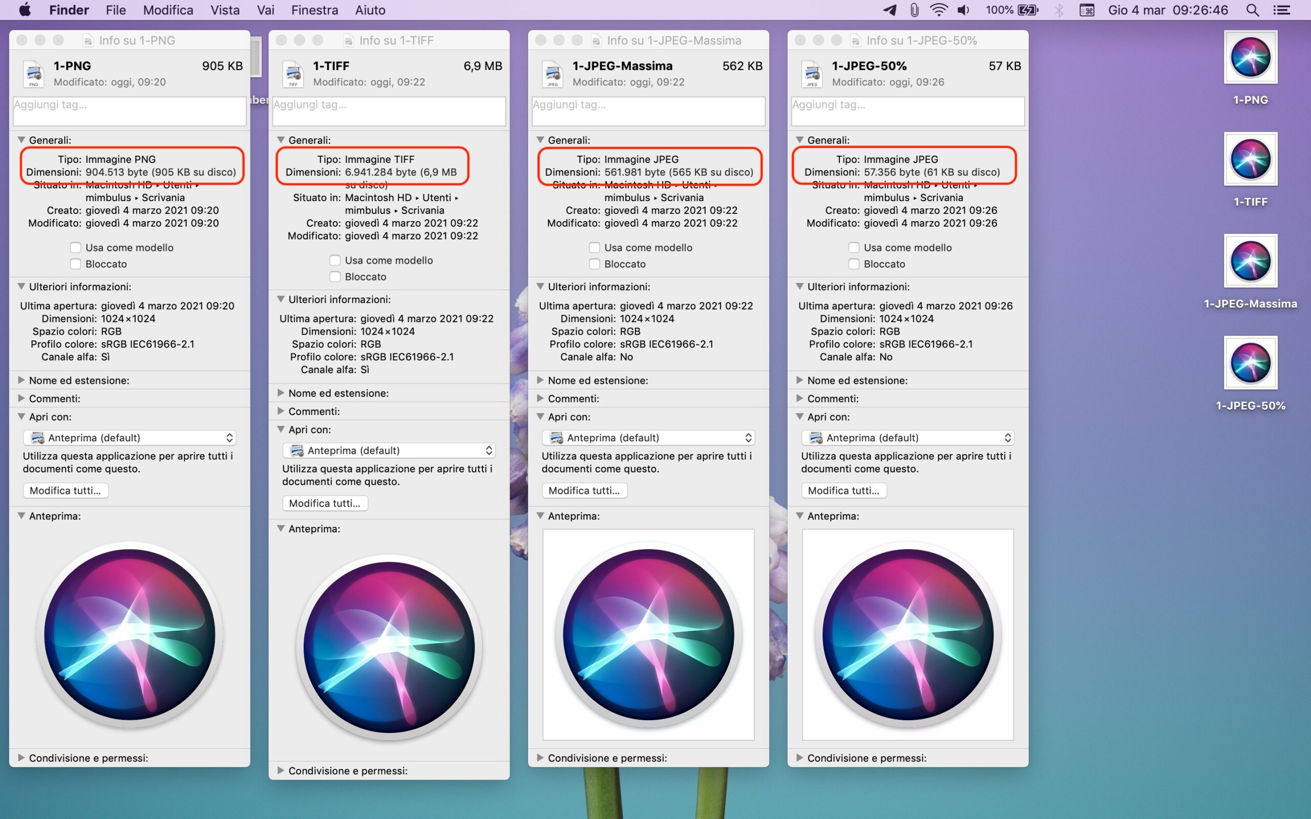 Per dire: l’icona dell’app Siri occupa poco meno di 1 MB in PNG, mentre in formato TIFF il peso sfiora i 7 MB. Col JPEG al 100% della qualità siamo poco sotto i 600 KB mentre con una riduzione della qualità del 50% il peso del file è di appena 61 KB.