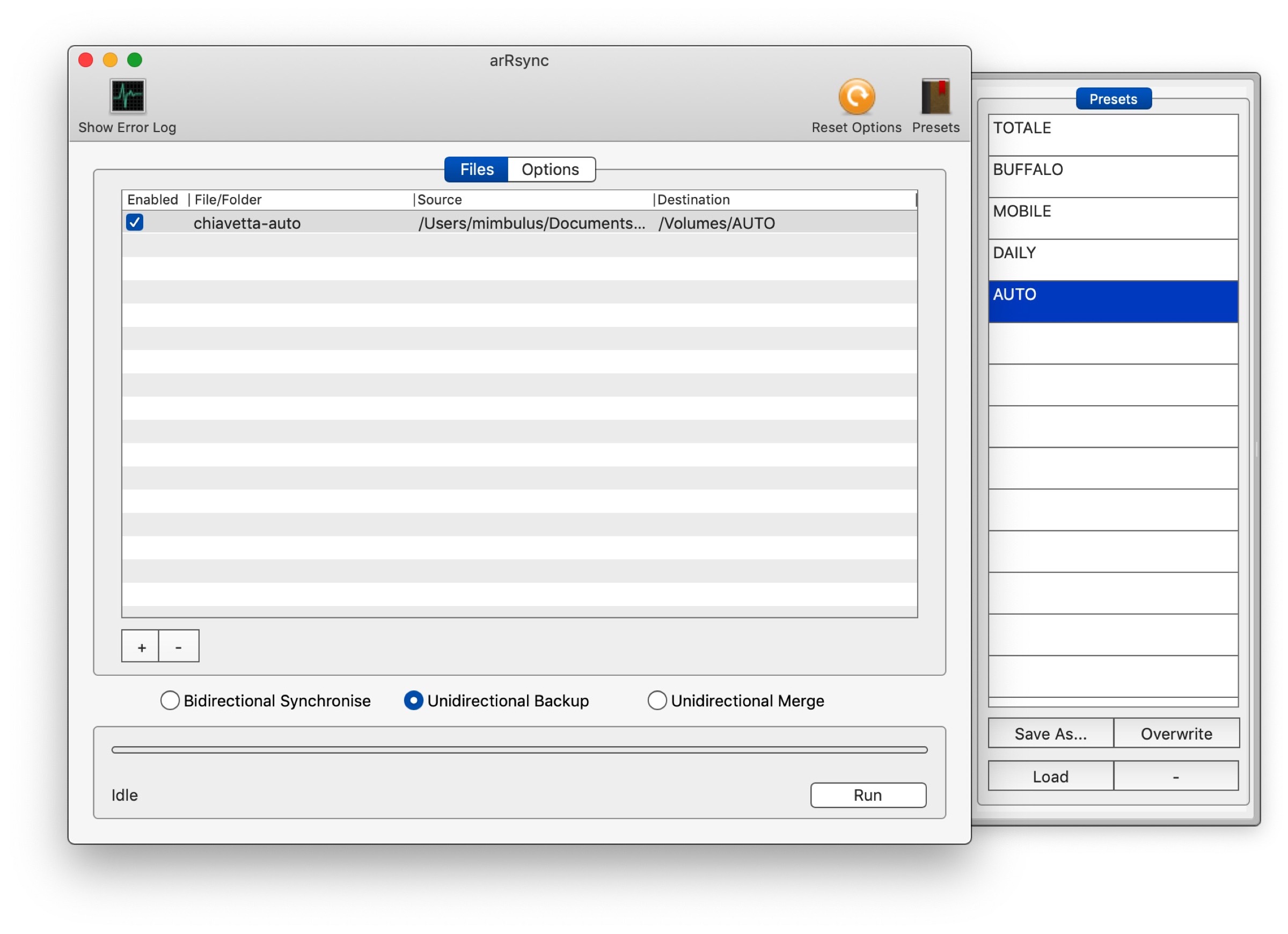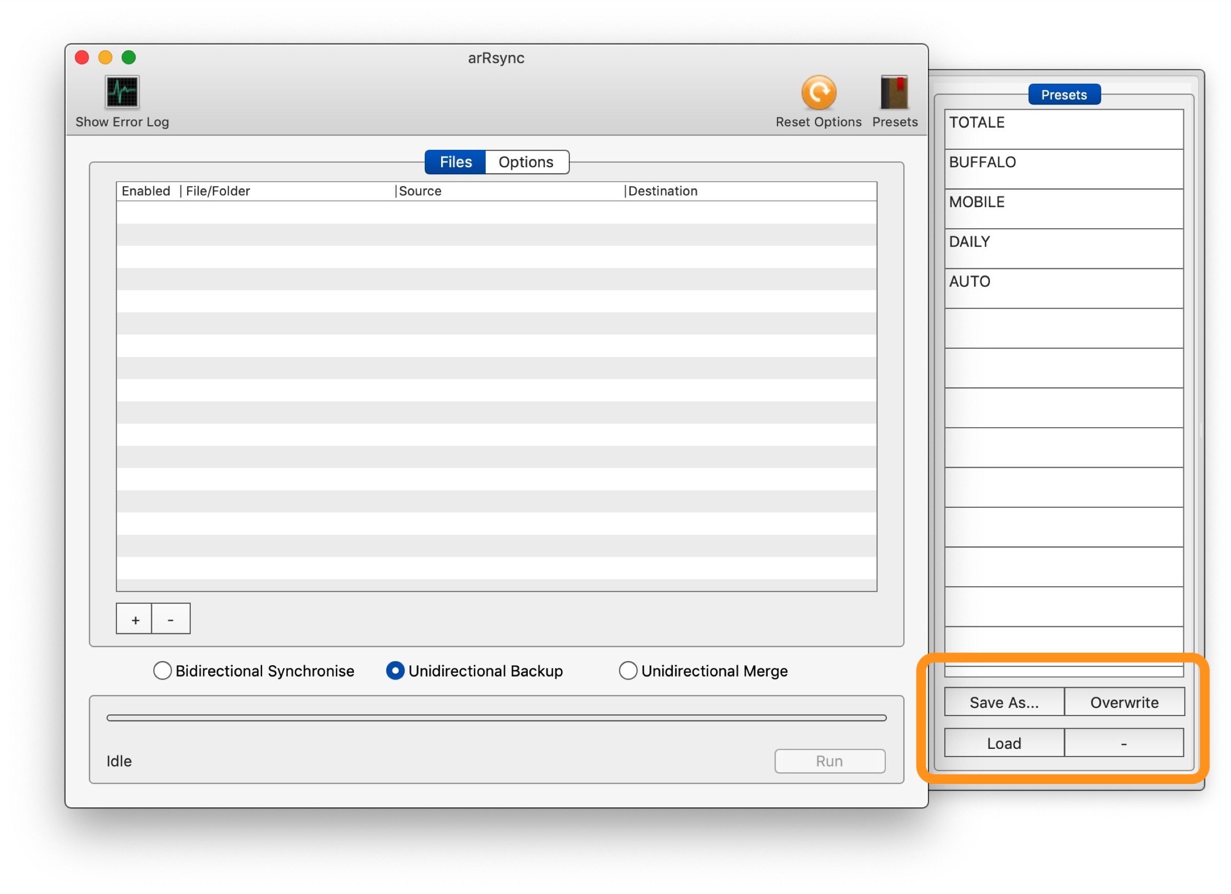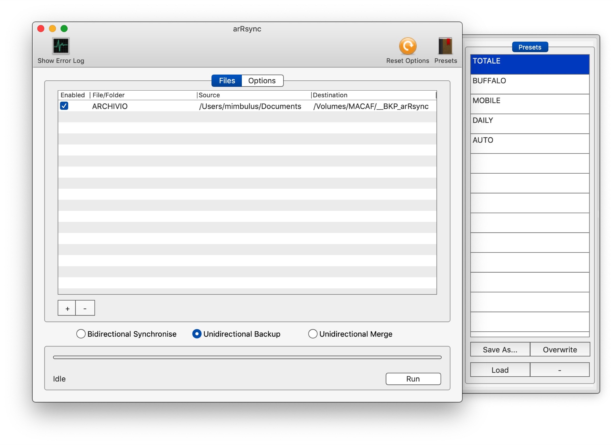- Overwrite per sovrascrivere eventuali cambiamenti apportati al preset, ad esempio se si aggiunge o rimuove un file/cartella da sincronizzare o se si modifica uno dei parametri del pannello Options;