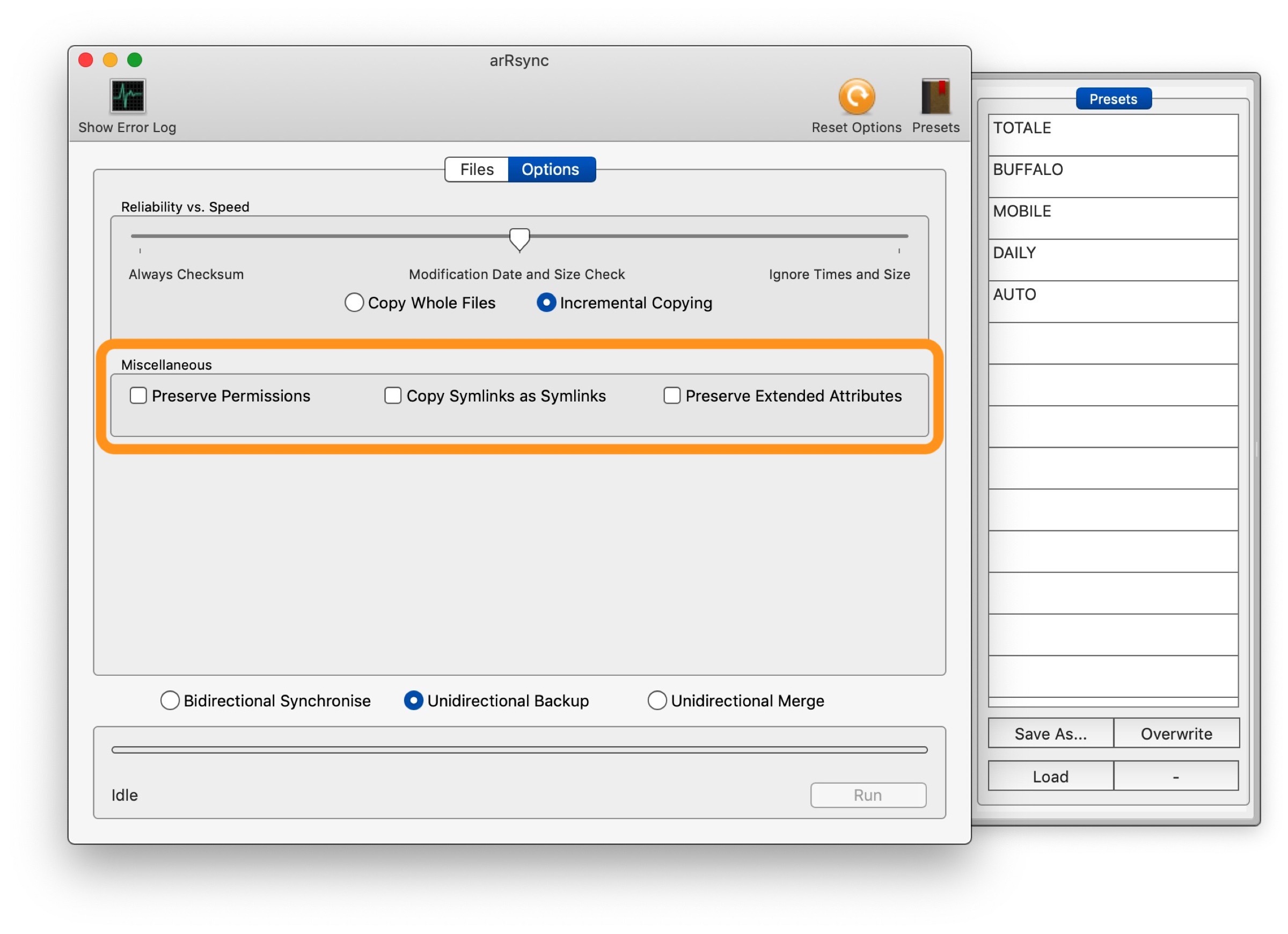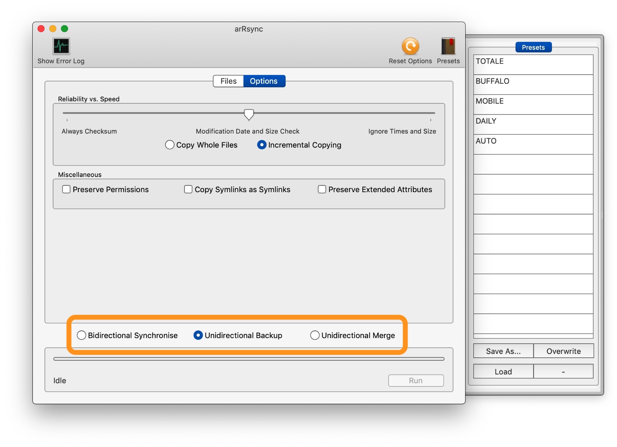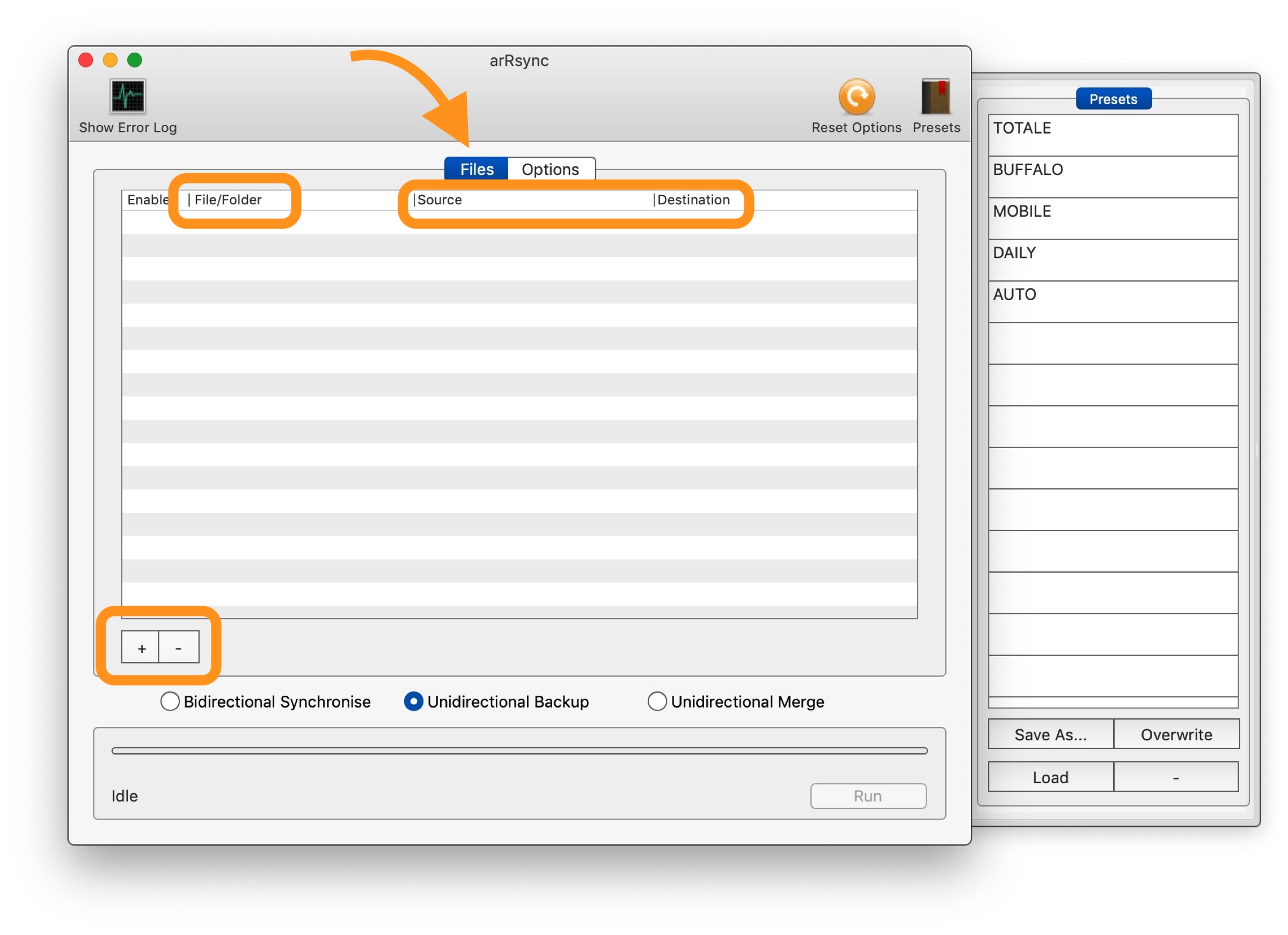 - Overwrite per sovrascrivere eventuali cambiamenti apportati al preset, ad esempio se si aggiunge o rimuove un file/cartella da sincronizzare o se si modifica uno dei parametri del pannello Options;
