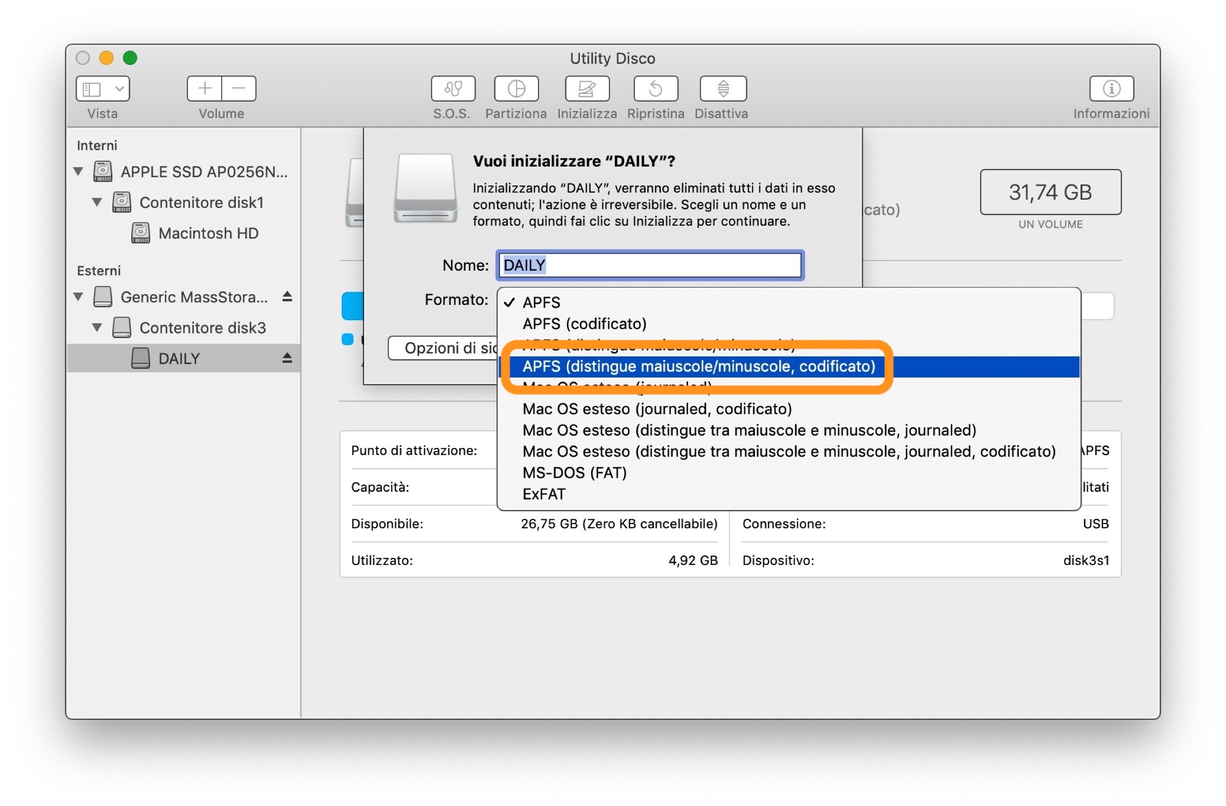 In tal caso potrebbe essere una buona idea formattare la memoria in formato APFS in quanto include funzionalità di crittografia native a livello di file. È vero che così facendo limitate l’accesso ai dati soltanto su macchine Apple con macOS 10.13 (2017) e successivi, ma li proteggete anche dietro una password a prova di hacker.