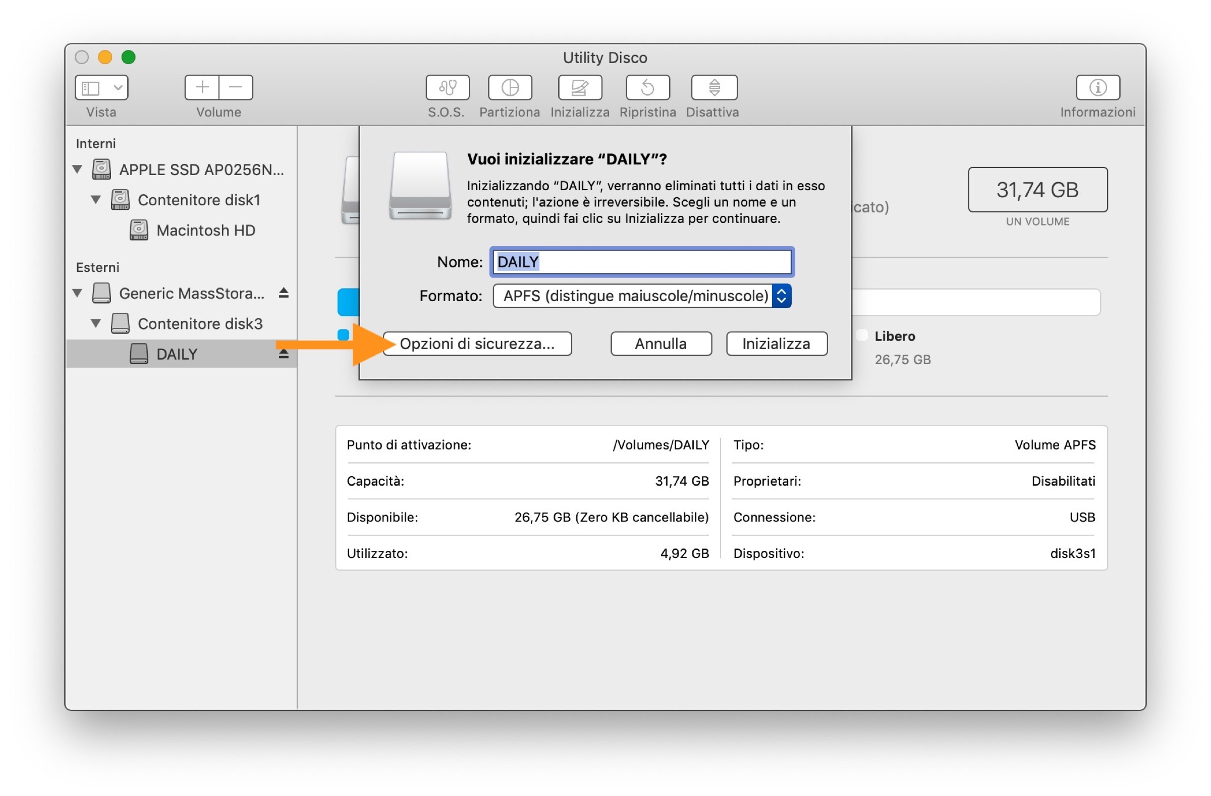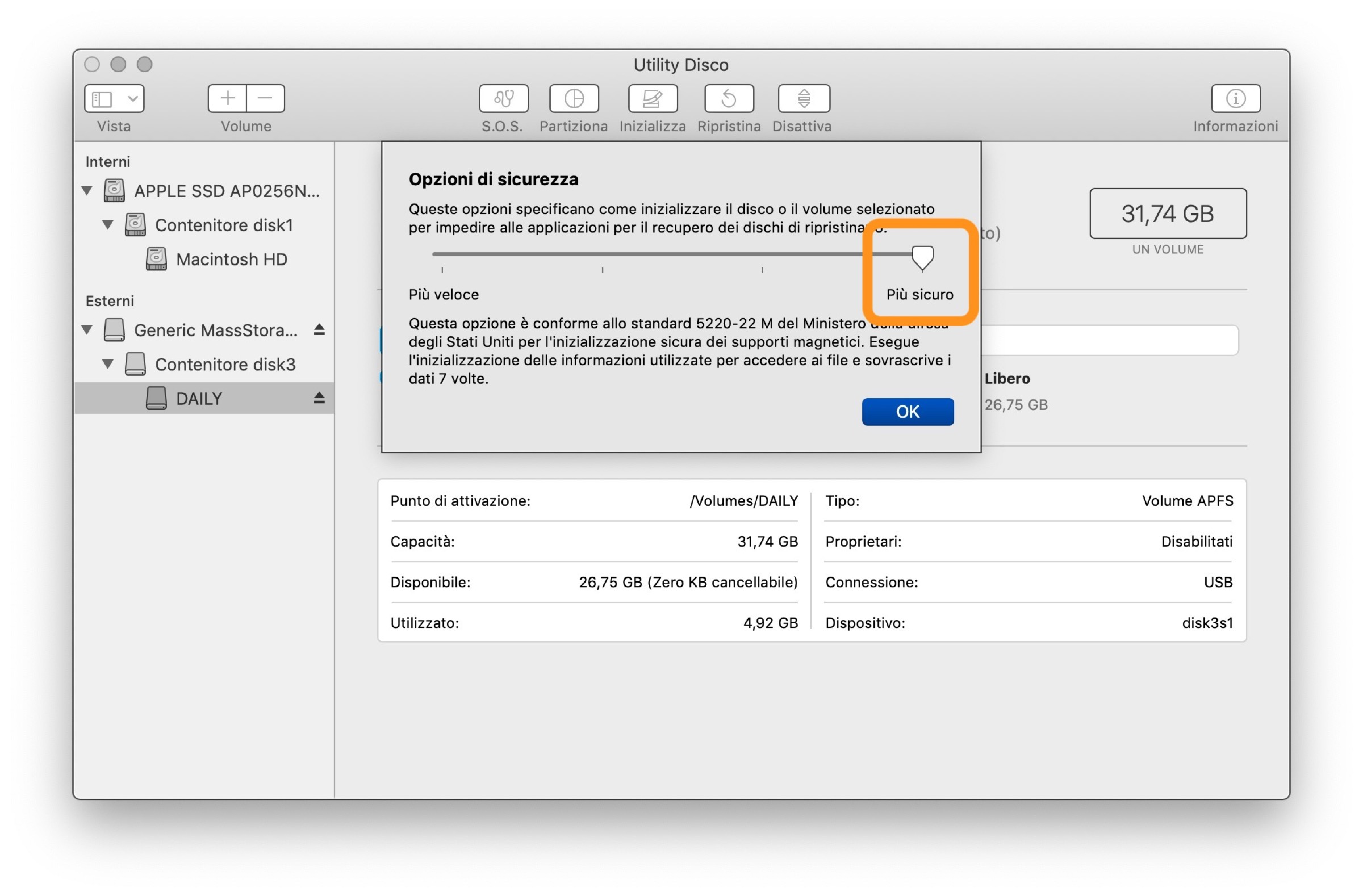 Questa opzione – scrive Apple – è conforme «allo standard 5220-22 M del Ministero della difesa degli Stati Uniti per l’inizializzazione sicura dei supporti magnetici. Esegue l’inizializzazione delle informazioni utilizzate per accadere ai file e sovrascrive i dati 7 volte». In questo modo i dati presenti sulla scheda prima della formattazione diventano praticamente irrecuperabili.