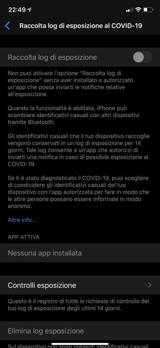 Con la nostra autorizzazione, le notifiche di esposizione possono essere utilizzate da un’autorità sanitaria pubblica o governativa per inviare una notifica nel caso abbiamo avuto contatti con qualcuno che ha segnalato di aver contratto il COVID-19. Se scegliamo di abilitare le notifiche di esposizione, l’app richiederà l’autorizzazione per salvare e condividere degli identificativi casuali. In questo modo, il nostro dispositivo potrà utilizzare il Bluetooth per trasmettere un identificativo casuale (gli “identificativi Bluetooth”), ossia una stringa di numeri casuali che cambia ogni 10–20 minuti.