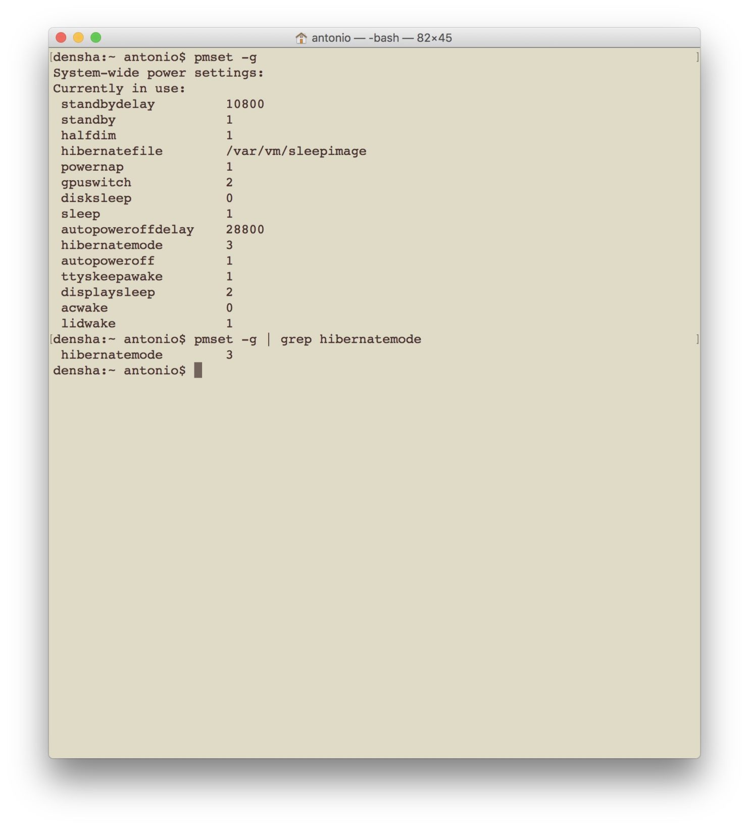 hibernatemode=3 vuol dire che è attivo (tipico dei MacBook) nella modalità “Safe Sleep”: dà energia alla Ram ma se va via la corrente usa la copia dei dati salvata su disco.
