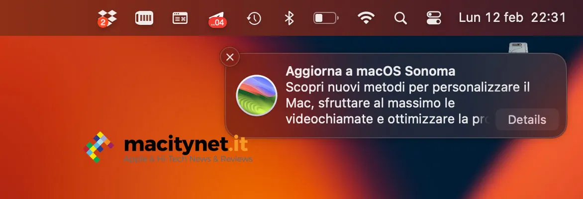 A vari utenti è comparsa una notifica nella quale si suggerisce di passare a macOS Sonoma; cliccare inavvertitamente sulla “X” di chiusura della notifica, anziché sul pulsante “Dettagli”, sembra a quanto pare forzare il download. Vediamo di seguito come aggiornare il sistema operativo attuale e come impedire di installare inavvertitamente sistemi più recenti, senza il nostro consenso