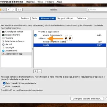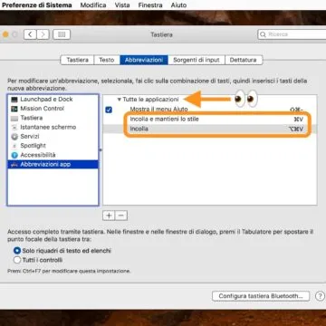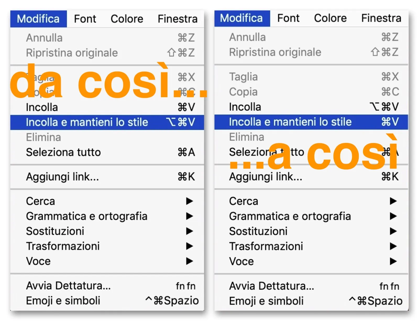 A questo punto nell’elenco troverete la nuova istruzione aggiunta, che si chiama appunto Incolla e mantieni lo stile ed è associata alla scorciatoia ⌘V.