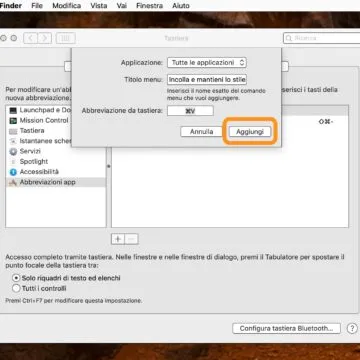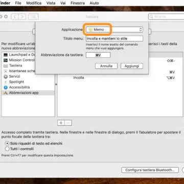 Ora, se volete, ripetete lo stesso ciclo di istruzioni dal punto 5 per aggiungere un nuovo comando, questa volta con voce Incolla e combinazione tasti ⌥⌘V, in modo da avere ancora a disposizione una scorciatoia per usare il classico Incolla senza dover necessariamente passare per il menu Modifica dalla barra di stato.