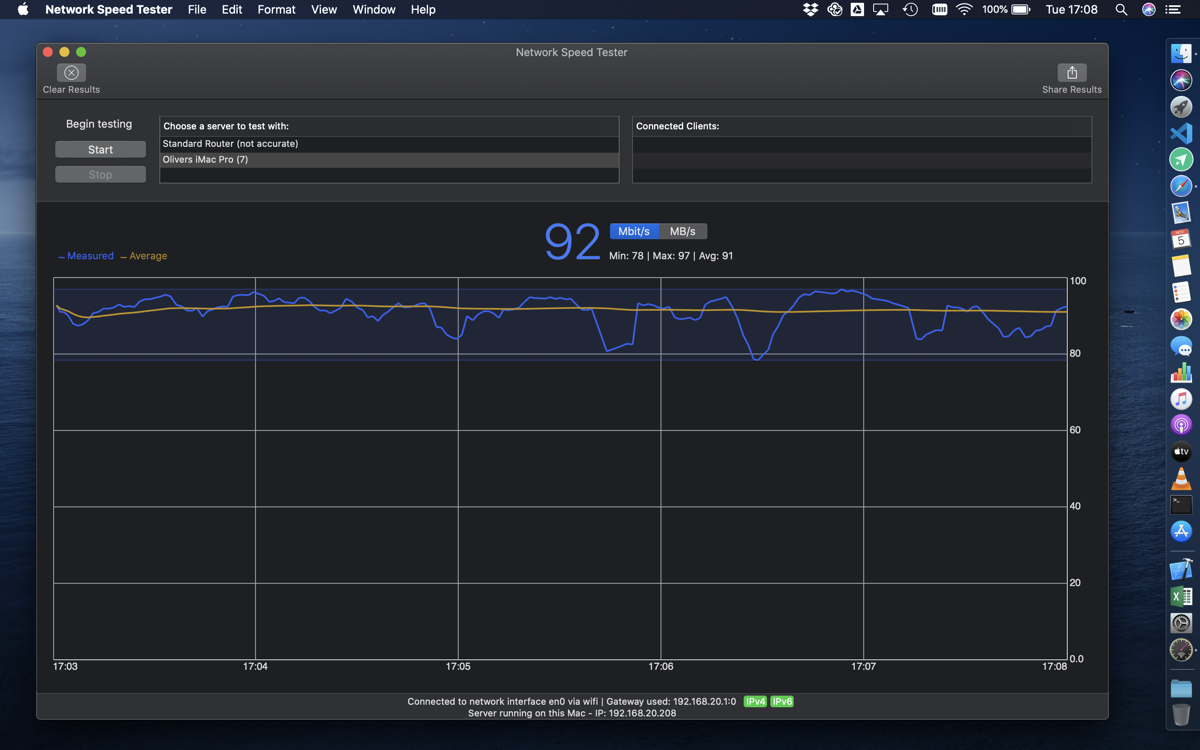 Si può far in vari modi, inclusi comandi a Terminale (il comando iPerf, ne abbiamo parlato qui) ma se siete alla ricerca di uno strumento di facile uso per Mac, uno dei migliori e più semplici è “Network Speed Tester”, una completa suite di app che consentono di testare la velocità delle reti locali. Il funzionamento di queste app è simile per tutte: bisogna disporre di almeno due dispositivi; uno di questi diventa il “server” l’altro è il “client” e con l’app specifica mostrerà i risultati.