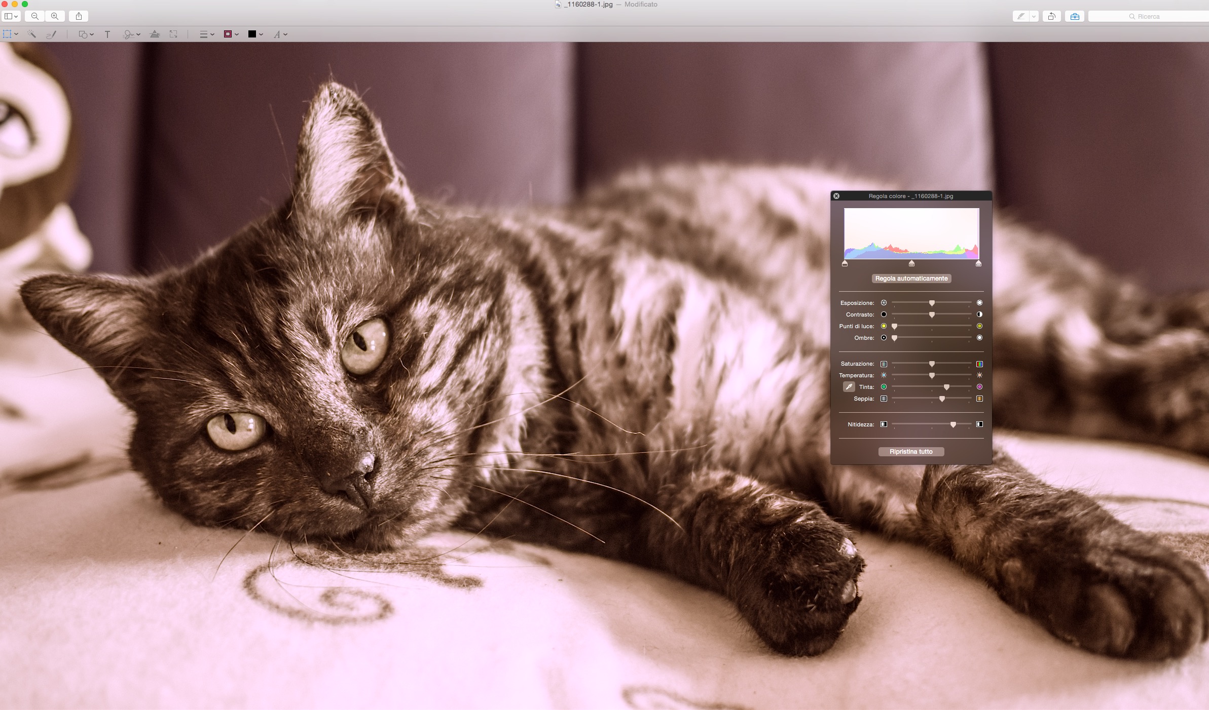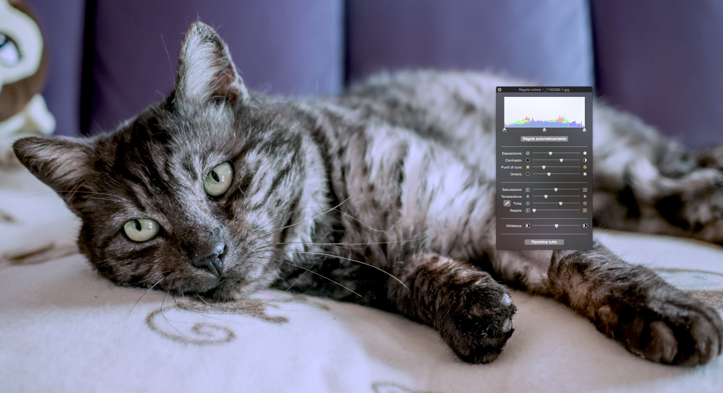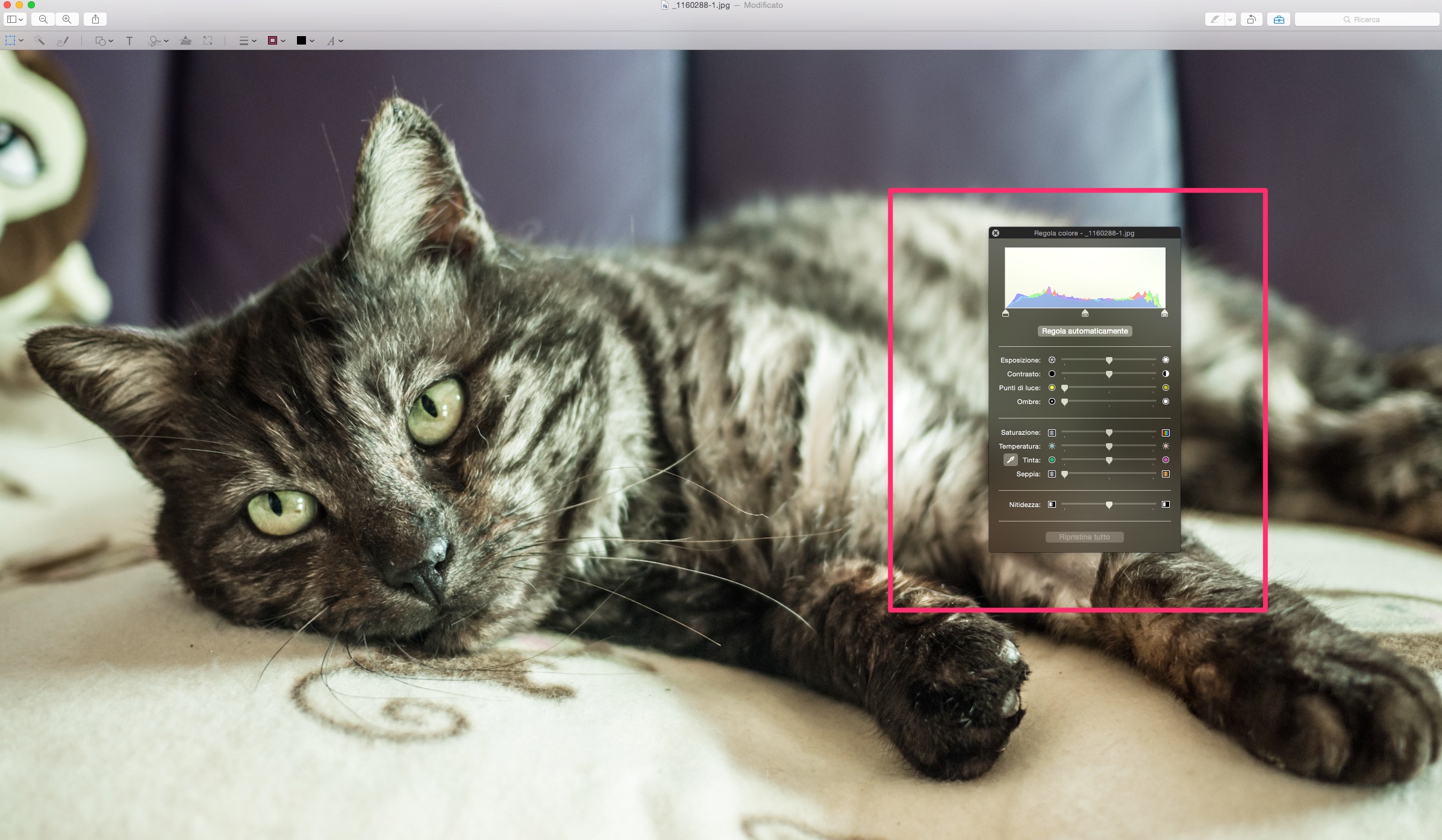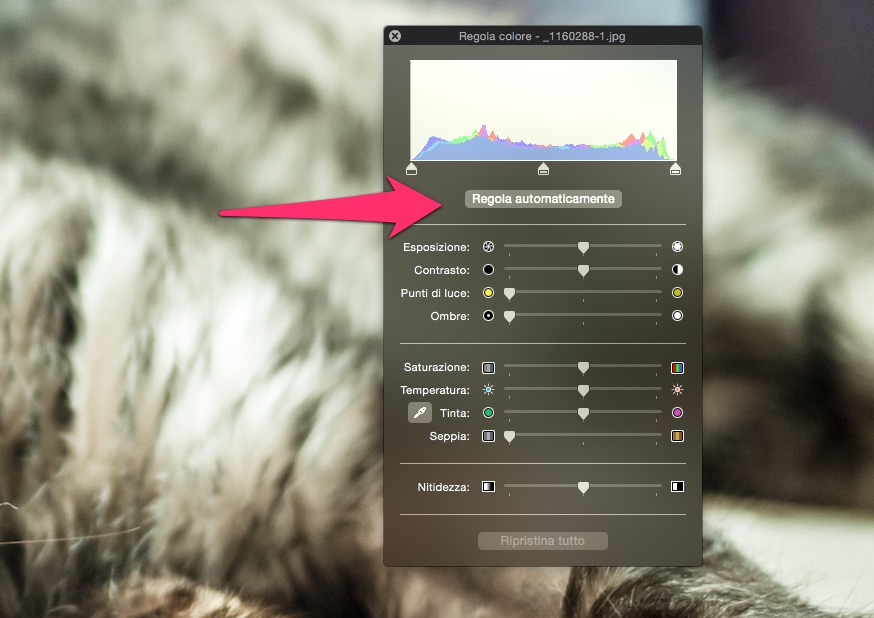 Da questo menù è possibile osservare l’istogramma dell’immagine, al di sotto del quale è già disponibile il tasto “Regola automaticamente” che permette in solo click di migliorare le immagini in un baleno, sempre secondo i calcoli e i parametri di Anteprima.