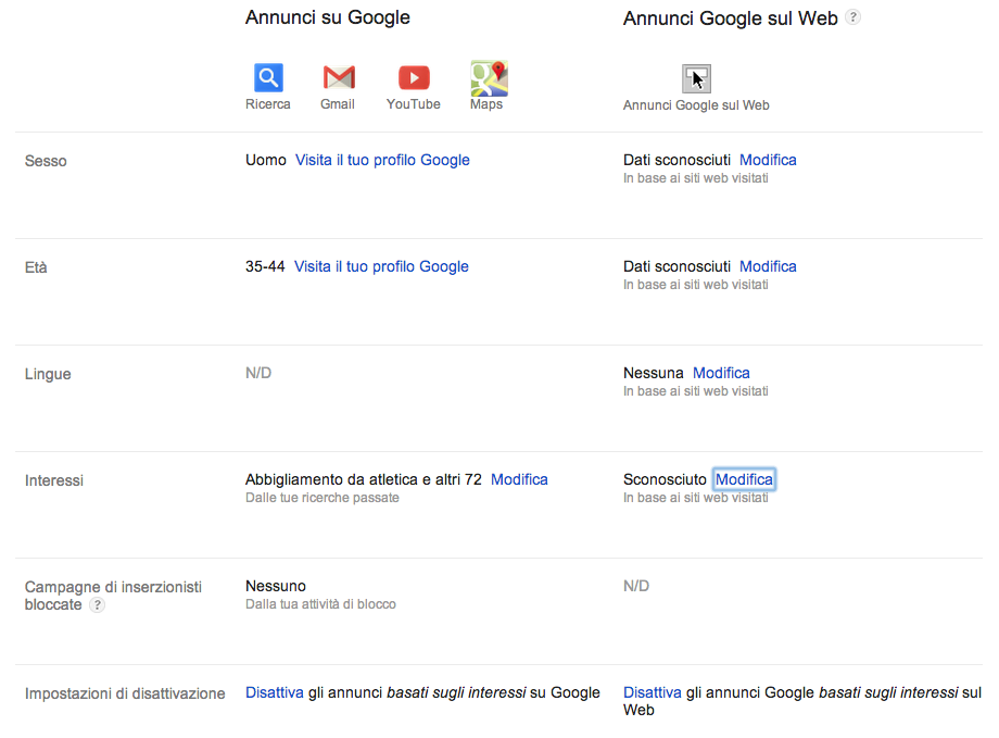 Alcune indicazioni, come età o sesso, vengono prese direttamente dal proprio account Google, ormai legato a Google+; viene compilato poi un elenco di interessi in base allo storico delle ricerche, che include categorie e sotto categorie che rappresentano temi che potrebbero essere interessanti per gli utenti e per la costruzione di un profilo pubblicitario su Google; infine è possibile visionare le campagne bloccate – se ce ne fossero – e decidere di eliminare la possibilità di essere raggiunti da annunci basati su interessi. La opzioni sui siti di Google sono molto più ampie rispetto agli annunci sul web, ma si tratta comunque di uno strumento interessante non solo per chi non vuole essere disturbato dalla pubblicità ma anche per chi invece vuole affinare gli annunci che vedere durante la sua attività online in base al profilo pubblicitario su Google.