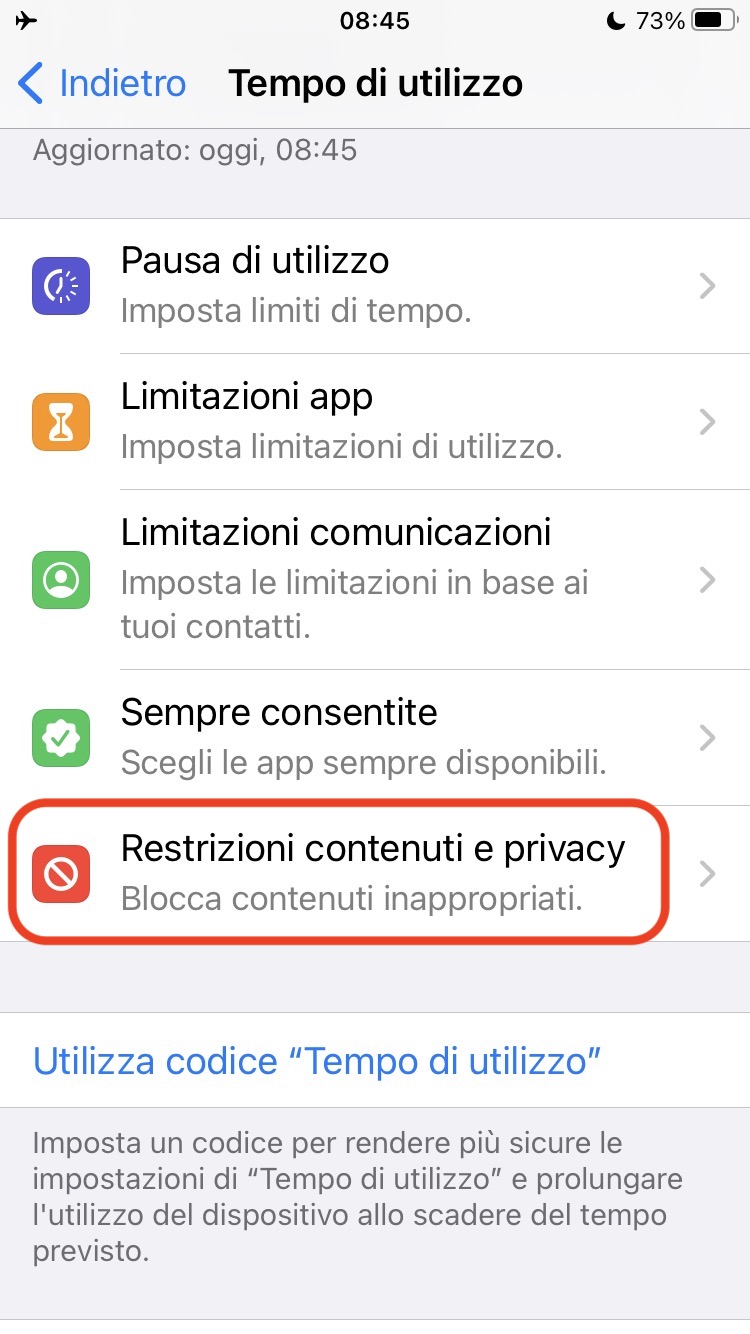 Non resta quindi che impostare un codice di sblocco per “Tempo di utilizzo”: in questo modo solo chi conosce la sequenza corretta (e quindi, si spera, soltanto voi stessi) potrà modificare ogni singola funzione presente in questa sezione del sistema operativo. Quindi, per impostarne uno, cliccate sul pulsante “Utilizza codice Tempo di utilizzo”, inseritelo due volte ed associatelo all’ID Apple, in modo tale da poterlo ripristinare usando la password dell’account Apple (che non dovrebbe conoscere nessun altro all’infuori di voi) qualora lo doveste dimenticare.