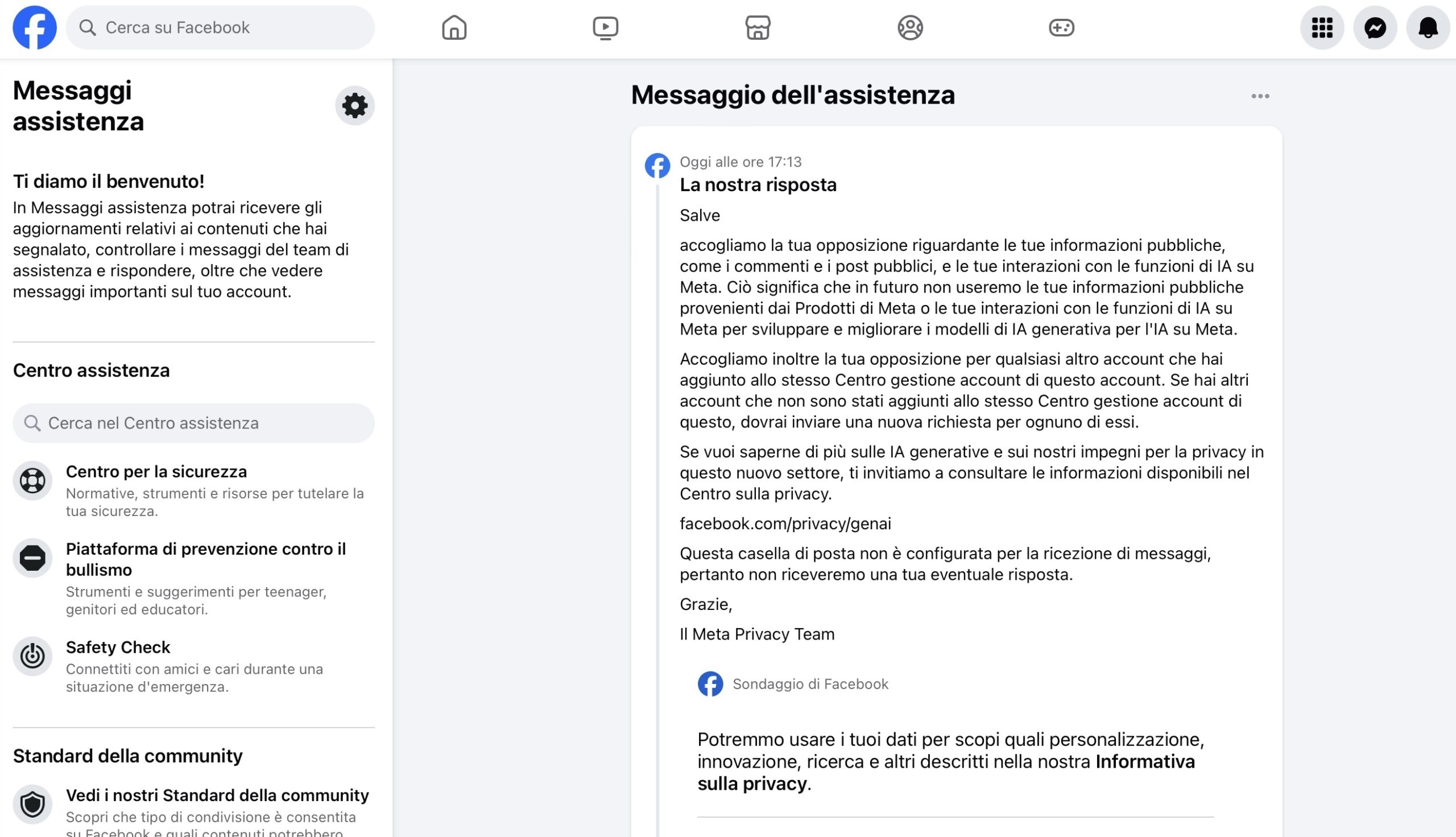 Qui sotto la risposta che Meta invia nel caso di opposizione alla condivisioni dei dati per l’AI.