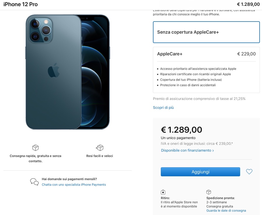 Aggiornamento ore 18,25 – iPhone 12 Pro Max quasi tutti esauriti
