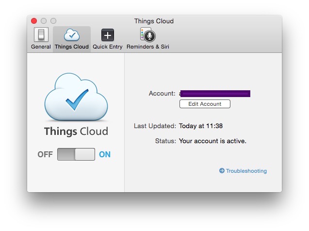 Se già utilizzate Things, e magari avete acquistato una nuova app per Mac o per uno degli iDevice, fate attenzione all’ordine con il quale accendete il cloud la prima volta. Partite dall’apparecchio che ha i dati che vi sono necessari, e proseguite con gli altri. Se più apparecchi hanno dati diversi, andate con l’ordine che preferite. L’importante è non iniziare con la versione di Things “vuota”, perché poi non sincronizzano più gli altri apparecchi verso il cloud. Nel caso, disattivate tutte le connessioni con il cloud e poi ripartite nell’ordine giusto.