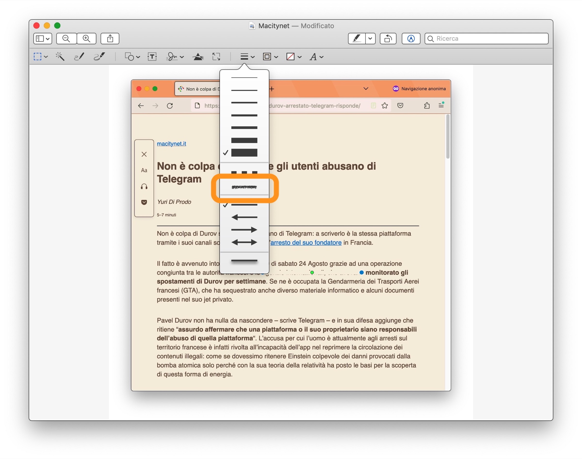 Al centro dell’immagine è apparsa una linea orizzontale di dimensioni, colore e forma variabili perché Apple “ricorda” l’ultima volta che avete usato questo strumento e vi ripropone la stessa configurazione.