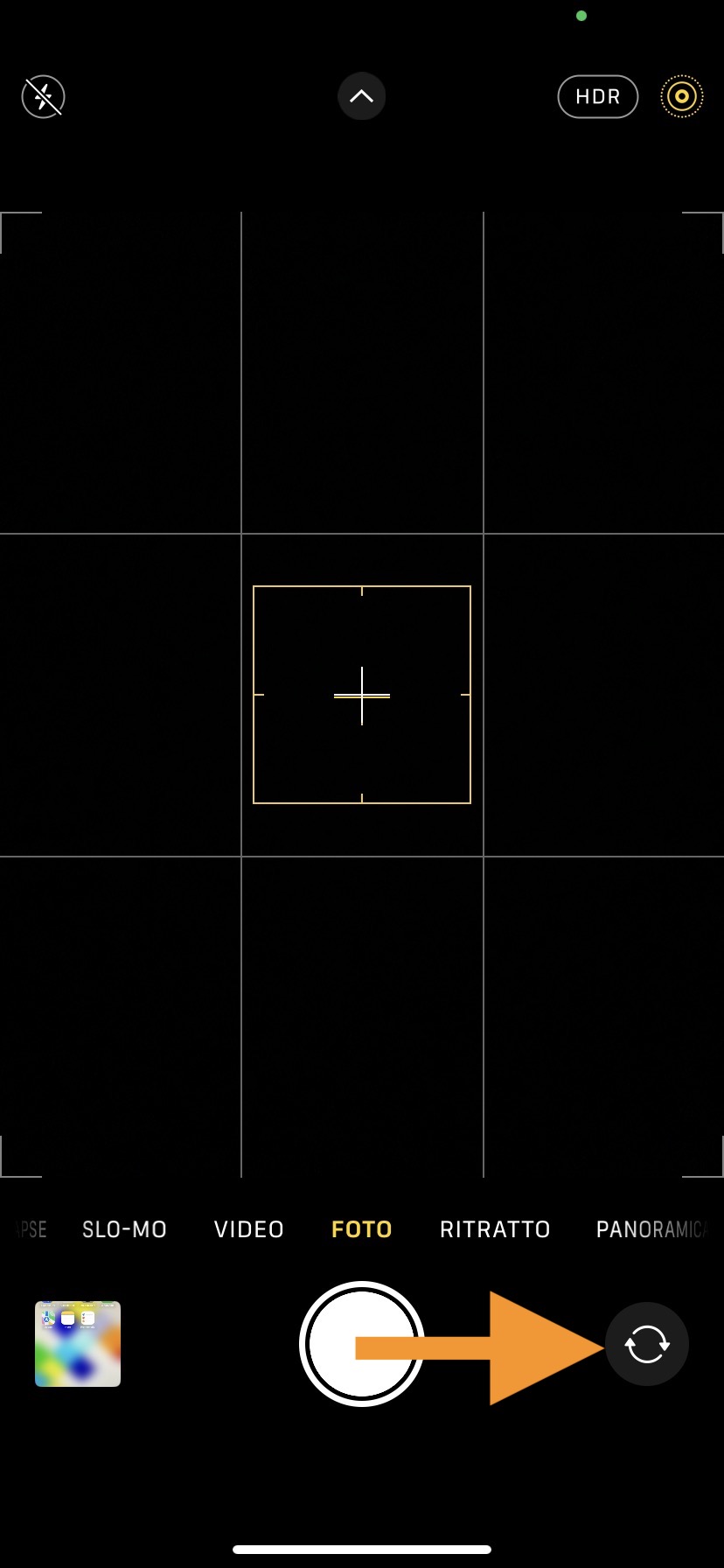 - Anziché però cliccare sul tasto di scatto, trascinatelo verso il pulsante che vi fa passare dalla fotocamera posteriore a quella principale (ovvero verso destra se state impugnando il telefono in verticale).
