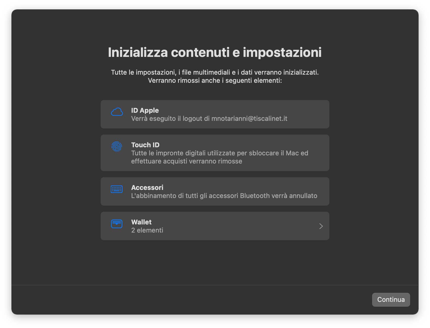Premendo “Continua” si accede alla schermata successiva dove sarà possibile seguire i vari passaggi per inizializzare il Mac.