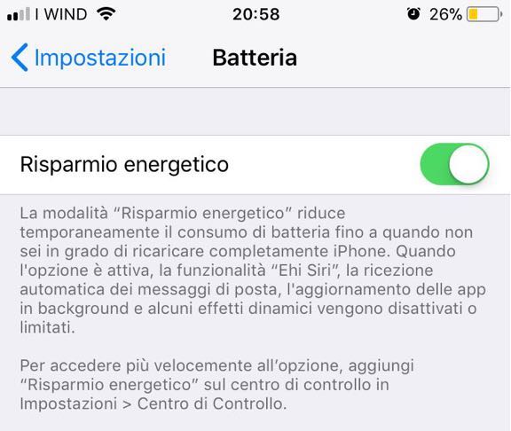 Nella stessa schermata Batteria è possibile attivare l’opzione Risparmio Batteria, che riduce temporaneamente il consumo di batteria. Quando l’opzione attiva, ad esempio, la funzionalità Ehi Siri, la ricezione automatica dei messaggi di posta, l’aggiornamento delle app in background e alcuni effetti dinamici vengono disattivati o limitati. Per accedere più velocemente a questa opzione, è possibile aggiungere il widget risparmio genetico sul centro di controllo.