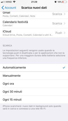 Soprattutto per coloro che non utilizzano lo smartphone per lavoro, e che non hanno necessità di essere aggiornati in tempo reale sull’arrivo di mail, il consiglio è quello di disattivare il controllo delle mail in entrata in tempo reale. Disattivando la funzione di push si dovranno controllare manualmente le email in entrata: sarà più scomodo, ma la batteria vi ringrazierà. Per disabilitare il controllo automatico in tempo reale delle mail è sufficiente recarsi su Impostazioni> Account & Password> e disattivare l’interruttore Scarica nuovi dati.