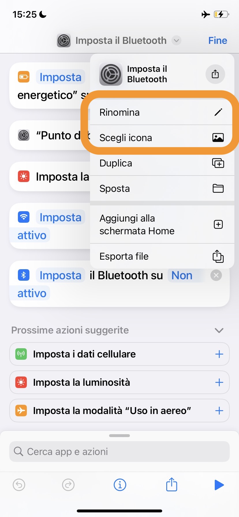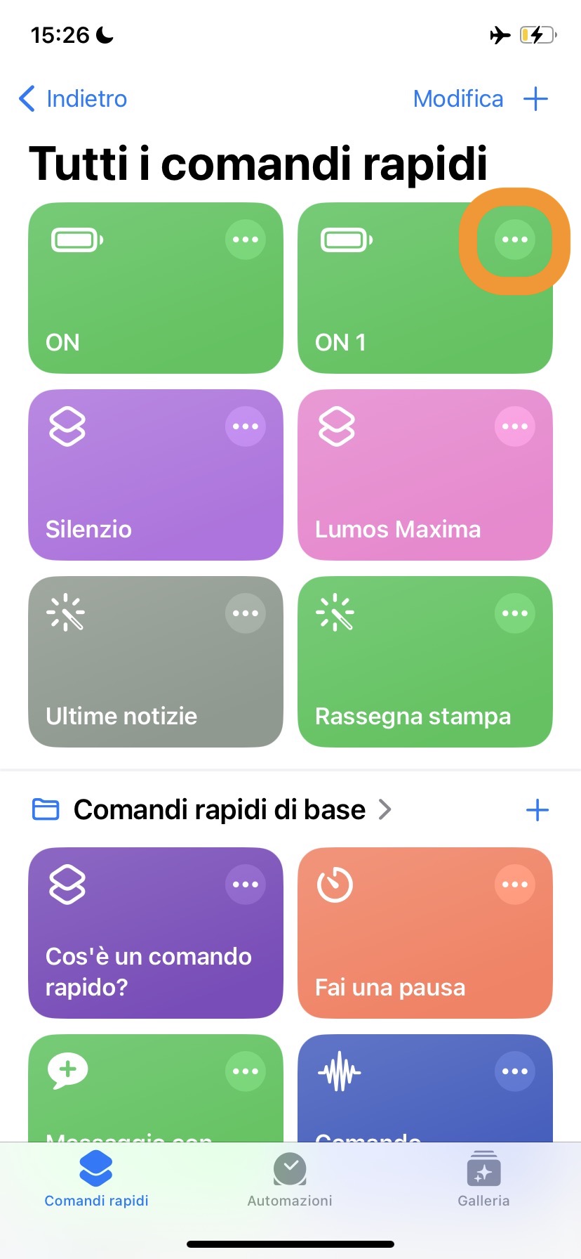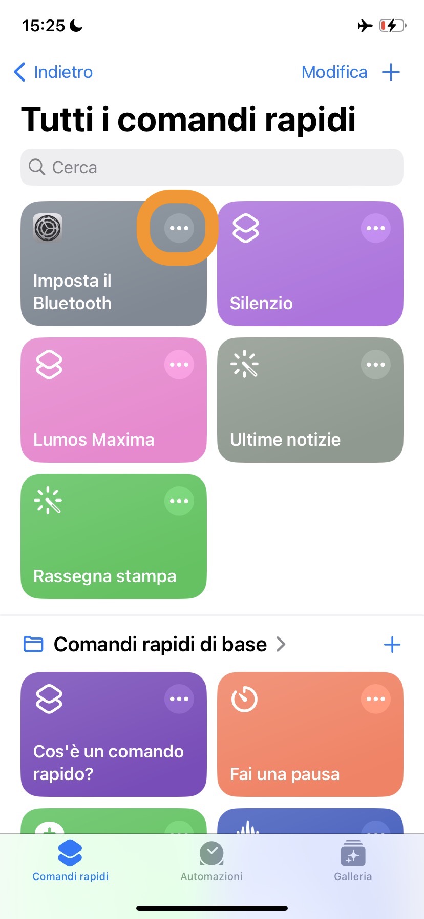 Se avete seguito le nostre istruzioni, a questo punto nella schermata principale chiamata Tutti i comandi rapidi avrete un nuovo comando su sfondo grigio chiamato Imposta il Bluetooth. Andiamo quindi a personalizzare il comando per renderlo più facilmente identificabile: