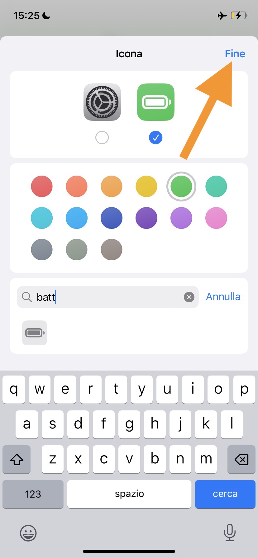 • Tornate poi nello stesso menu, cliccando questa volta su Scegli icona, scegliendo una immagine e un colore di sfondo a piacere (abbiamo puntato sul verde con l’icona batteria)