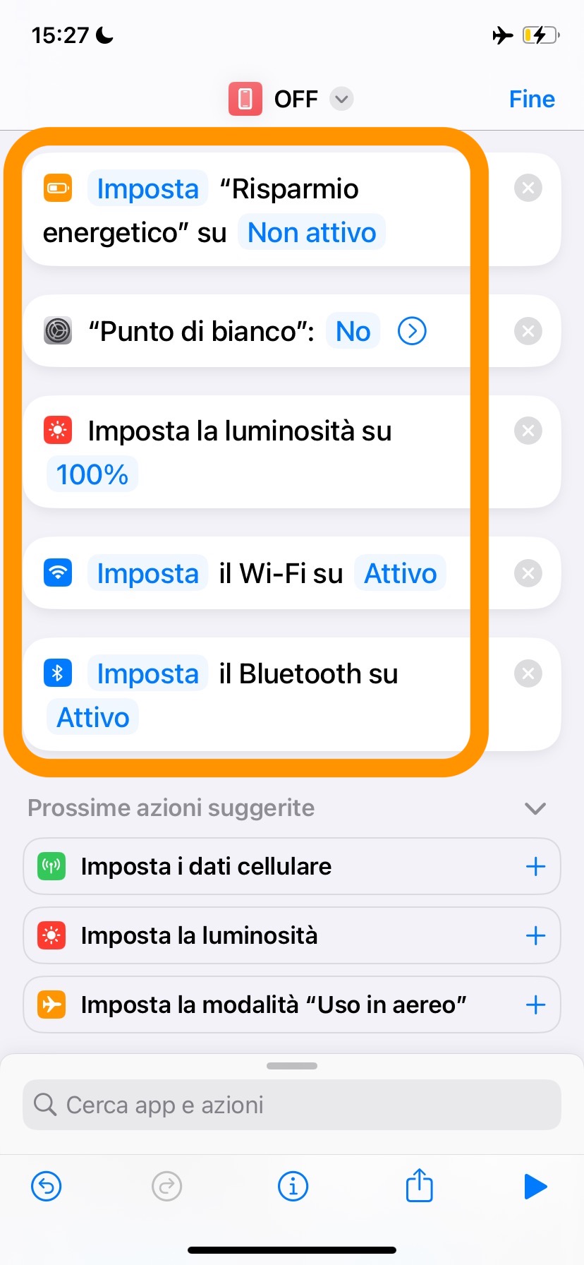 Se volete potete anche duplicare questa automazione invertendo le azioni che va ad eseguire, ripristinando così il normale funzionamento dell’iPhone. Alla fine vi ritroverete quindi con due icone sulla schermata principale, una per minimizzare i consumi, l’altra per disattivare queste modifiche. Se intendete procedere: