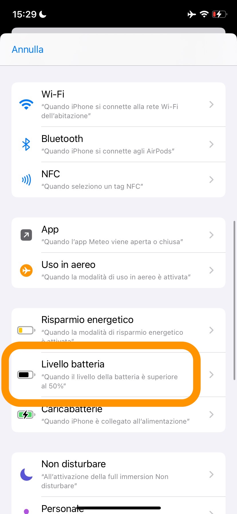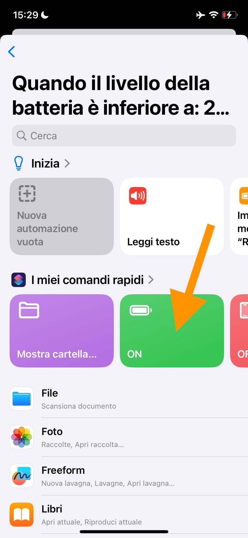 Volendo potete anche automatizzare il funzionamento di questi nuovi comandi, ovvero facendo in modo che si attivino da soli (ovvero senza doverci cliccare sopra) nel momento in cui il livello della batteria di iPhone scende/sale ad una determinata soglia percentuale. Per farlo: