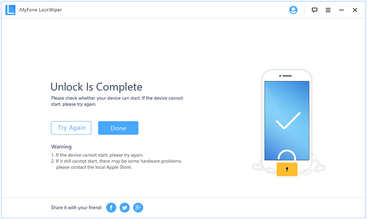 Al completamente dell’operazione sarà sufficiente cliccare su Done. Il vostro dispositivo iOS non sarà più bloccato nella schermata di blocco.