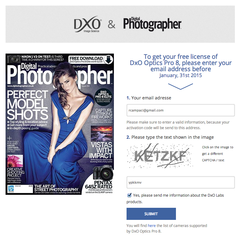 Grazie ad una collaborazione fra Digital Photographer e DxO Labs, è possibile ora scaricare gratis DxO Optics Pro 8, l’avanzato programma in grado di correggere foto RAW e Jpeg con memorizzate migliaia di lenti, semplicemente facendo richiesta sull’apposita pagina dedicata all’offerta. Dopo aver inserito la propria email, verrà inviato per posta elettronica il codice gratuito per sbloccare la licenza di DxO Optics Pro 8, oltre ad un link per scaricare il software, per Mac e per Windows.