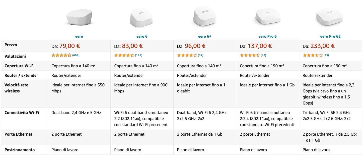 Sul sito di Amazon è possibile trovare diversi router eero; molti di questi nel momento in cui scriviamo sono in offerta (le trovate a fondo pagina) e la scelta è ormai vasta: come ci si orienta tra sigle e prestazioni? Vi guidiamo attraverso la tecnologia usata, le differenze e le funzionalità specifiche.