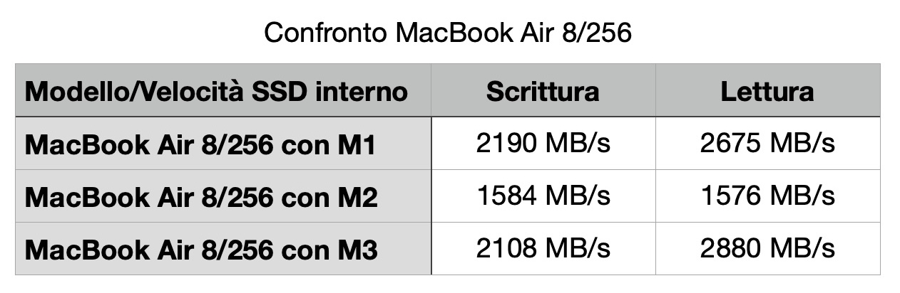 Abbiamo parlato all’inizio dell’SSD a bordo del MacBook Air: nelle nostre prove del piccolo di casa Apple abbiamo riscontrato che il modello base da 256 GB con M2 aveva prestazioni inferiori a quelle del corrispondente modello con processore M1.