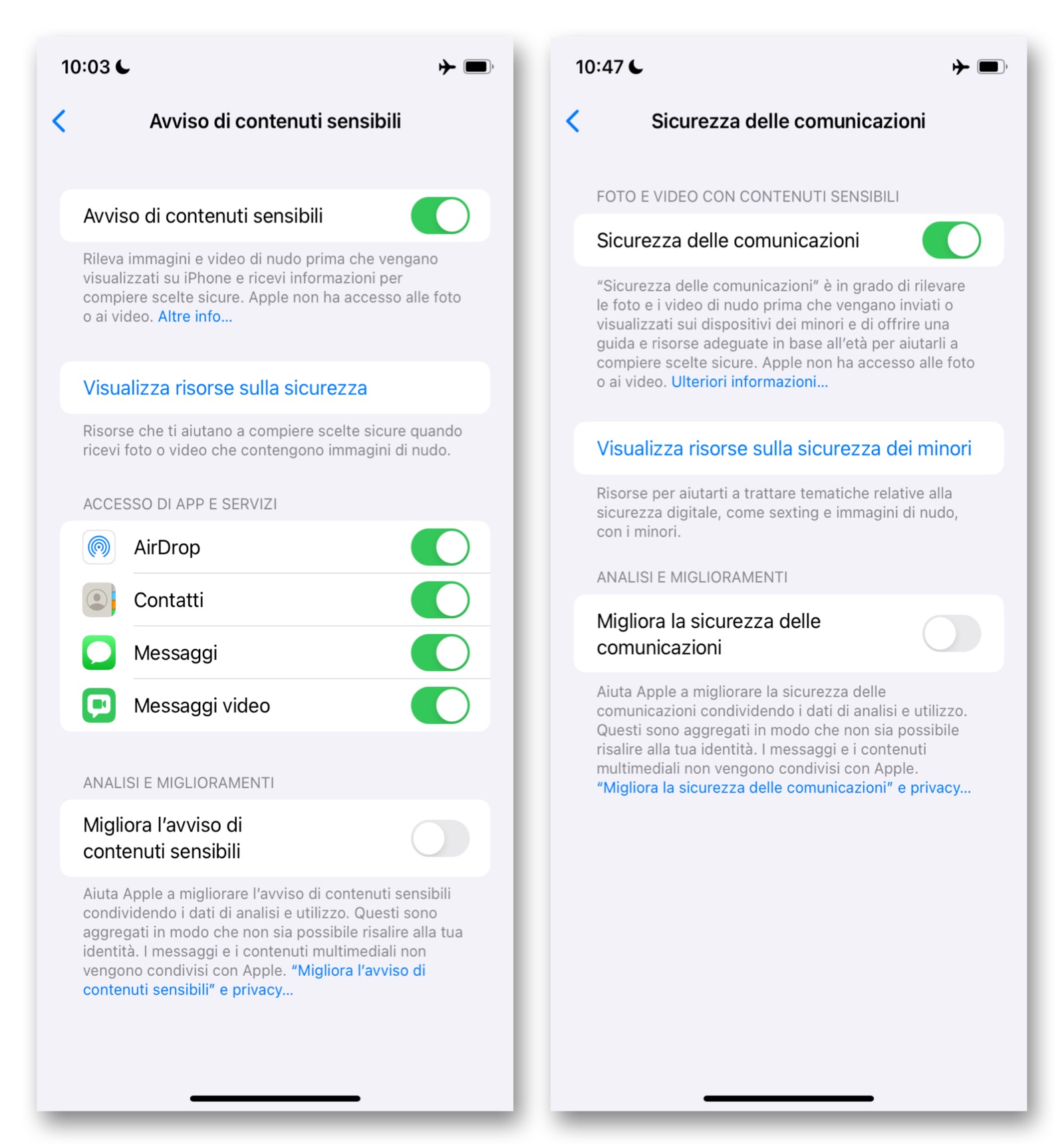 Già dallo scorso anno è possibile attivare la funzione di Sicurezza delle comunicazioni nei dispositivi dei propri figli, andando così ad oscurare i contenuti sensibili in maniera analoga a quanto accade oggi con la nuova funzione di iOS 17, che è pensata invece per proteggere se stessi.