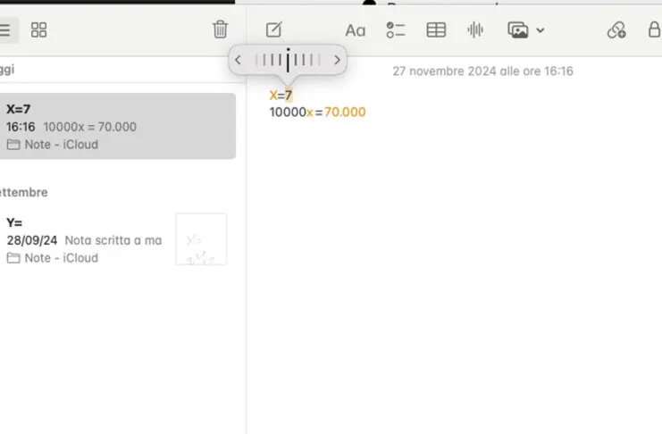 - Create una nuova nota e digitate una espressione seguita da segno “=”. Esempio, scrivendo “(27*2)/4=” apparirà a destra il risultato.