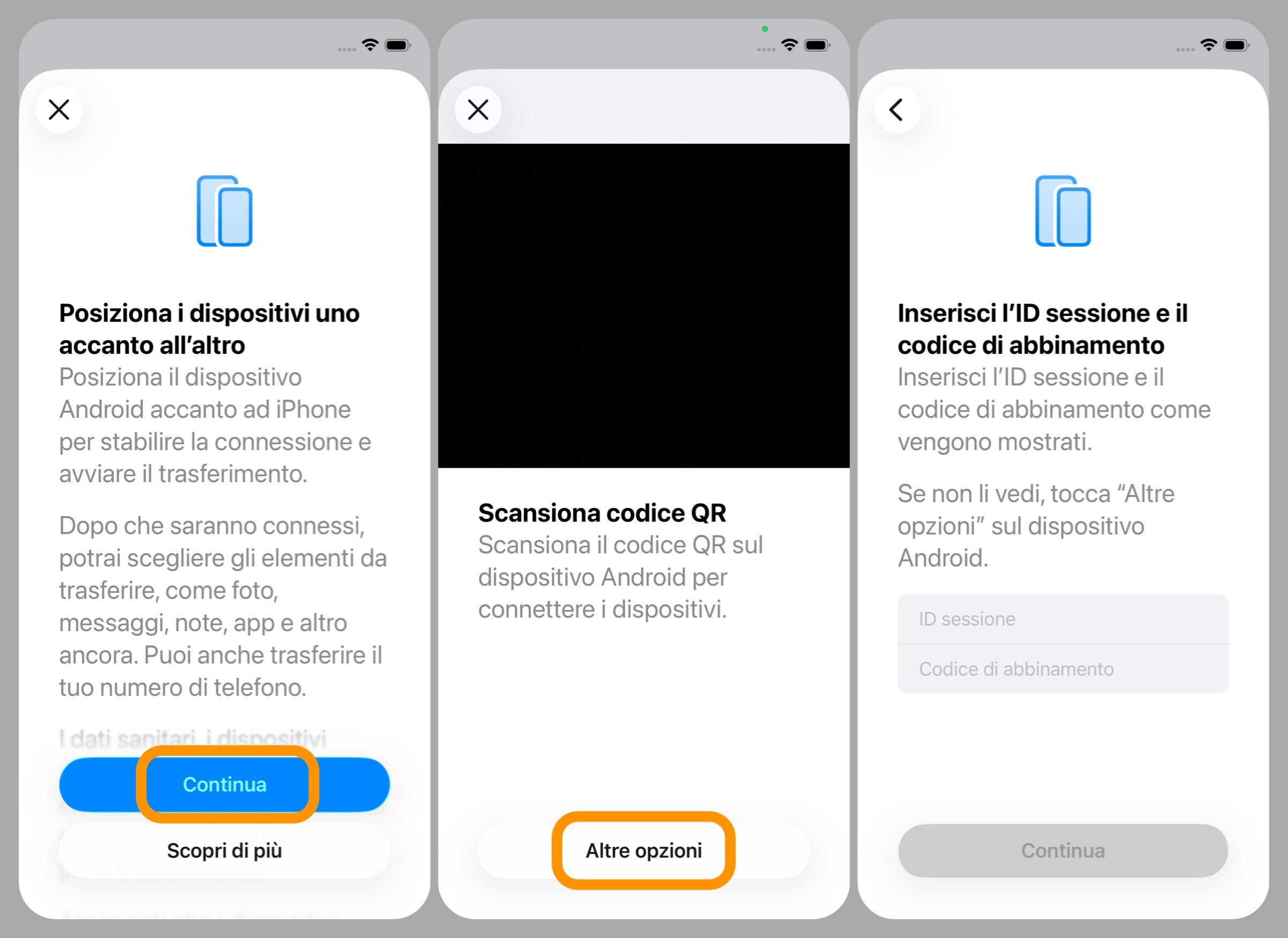 Per continuare vi basta scansionare questo QRcode tramite la fotocamera di iPhone oppure, qualora non fosse possibile, cliccando su Altre opzioni si accede alla schermata dove poter inserire manualmente l’ID sessione e il Codice di abbinamento mostrati sul dispositivo Android.