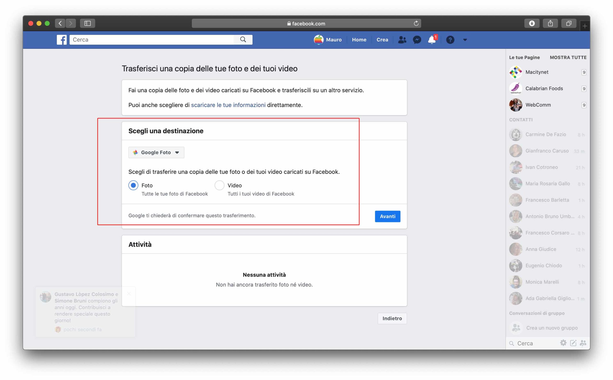 A questo punto è possibile scegliere la voce “Scegli una destinazione” e indicare “Google Foto”; è possibile selezionare “Foto” o “Video” e in tutti e due i casi Google chiederà di confermare il trasferimento. Ovviamente bisognerà eseguire il login con il proprio account Google. La velocità di trasferimento dipende ovviamente da quante foto sono presenti sul vostro account. Non è ad ogni modo un procedimento veloce: il trasferimento delle foto di un account di prova con circa 500MB di materiale ha richiesto circa un’ora. Al termine del processo si riceve una notifica relativa al completamento.