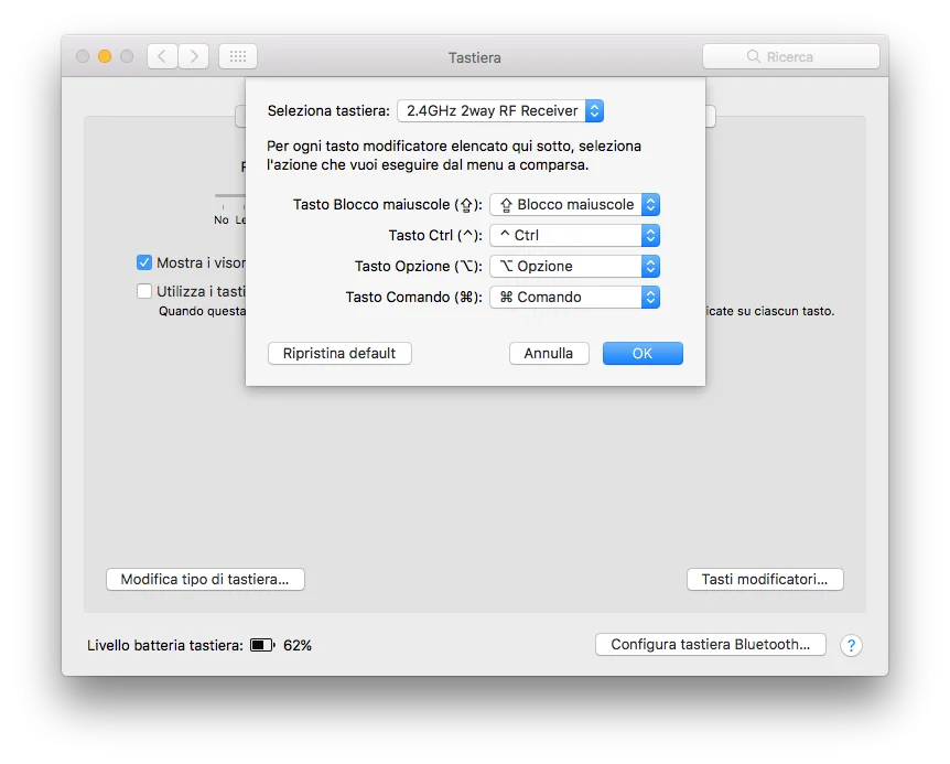Sostanzialmente, si dovranno mantenere invariati i tasti Blocco maiuscole e Ctrl, mentre dovranno essere invertiti i tasti Opzione e Comando. Più precisamente, per il tasto Opzione (⌥) si dovrà selezionare ⌘ Comando, e per ⌘ Comando si dovrà selezionare (⌥) Opzione.