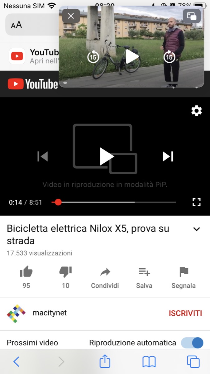 Funziona infatti con le applicazioni di Apple come Safari e FaceTime, mentre per averla ad esempio nei video dell’app YouTube o con le videochiamate di Whatsapp bisognerà attendere che gli sviluppatori implementino le nuove API di Apple. Quindi per il momento è piuttosto limitata, ma se desiderate cominciare a prenderci confidenza, non vi resta che avviare un video di YouTube dall’app di Safari, visualizzarlo a tutto-schermo, quindi pigiare sul nuovo pulsante della modalità PiP rappresentato da due rettangoli, uno dentro l’altro, collegati da una freccia.