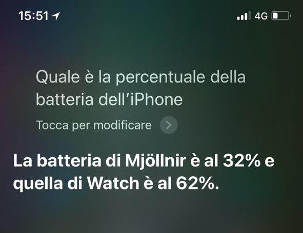 Se si guarda bene alla Home del nuovo dispositivo, nell’angolo in alto a destra, si scopre che appare solo il simbolo della batteria, senza l’esatta percentuale. Ed allora, il primo metodo per verificare la percentuale esatta della batteria è chiedere a Siri. L’assistente vocale di Apple, nel fornire la risposta testuale, mostrerà a schermo l’esatta percentuale rimanente, come mostra la foto in basso (dove Mjöllnir è il nome dell’iPhone X).