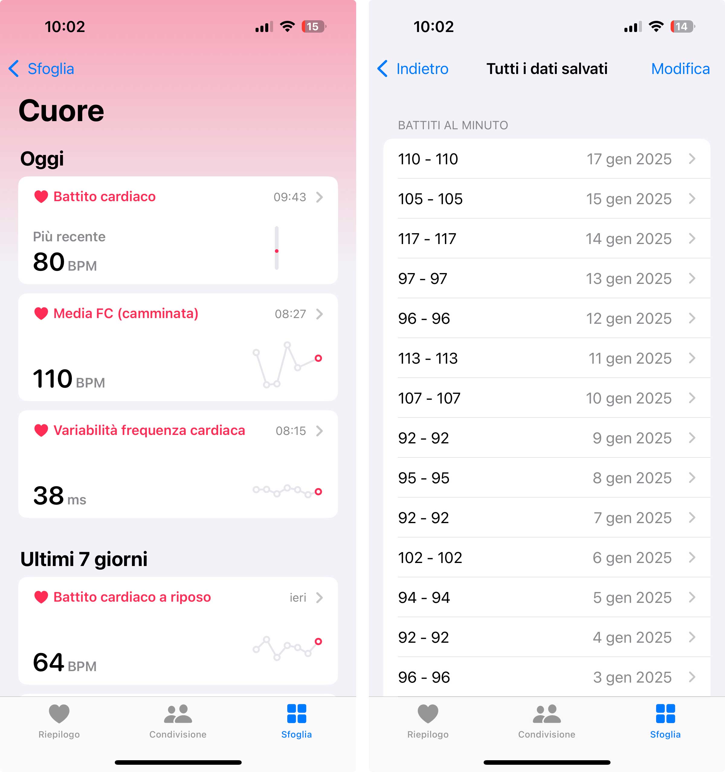 - Da qui è possibile selezionare varie categorie: “Battito Cardiaco” (valore che corrisponde al numero di battiti al minuto e può essere un indicatore della condizione cardiovascolare generale), “Variabilità frequenza cardiaca” (la misurazione della variazione dell’intervallo di tempo che trascorre tra un battito e l’altro), “Battito cardiaco a riposo” (la media dei battiti al minuto rilevata dopo un periodo di inattività o rilassamento di vari minuti), “Media FC Camminata” (la media dei battiti rilevata da Apple Watch quando si cammina a ritmo sostenuto durante la giornata).