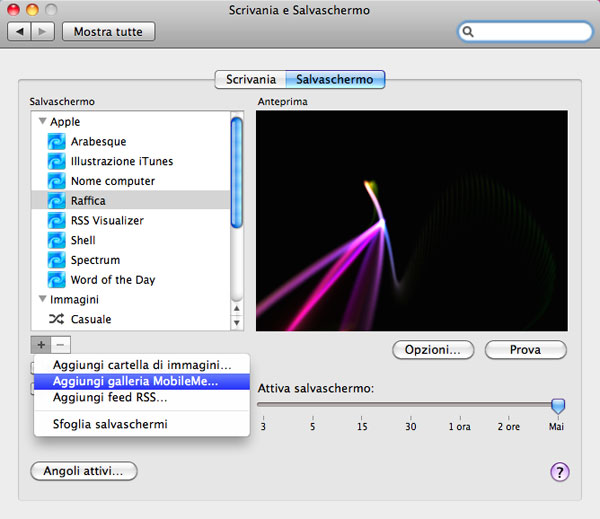 Con l’avvento degli schermi piatti la funzione screensaver non è più fondamentale, in ogni caso si tratta di un modo simpatico per animare il nostro Mac, spesso con un pizzico di originalità . Oltre agli eleganti effetti forniti da Apple e alle nostre immagini, con un paio di clic è possibile utilizzare come screensaver anche gli album fotografici pubblici disponibili sugli account MobileMe. Allo scopo possiamo utilizzare gli album presenti sul nostro account ma soprattutto le fotografie di amici e familiari che utilizzano MobileMe. Il tutto richiede meno di 30 secondi.