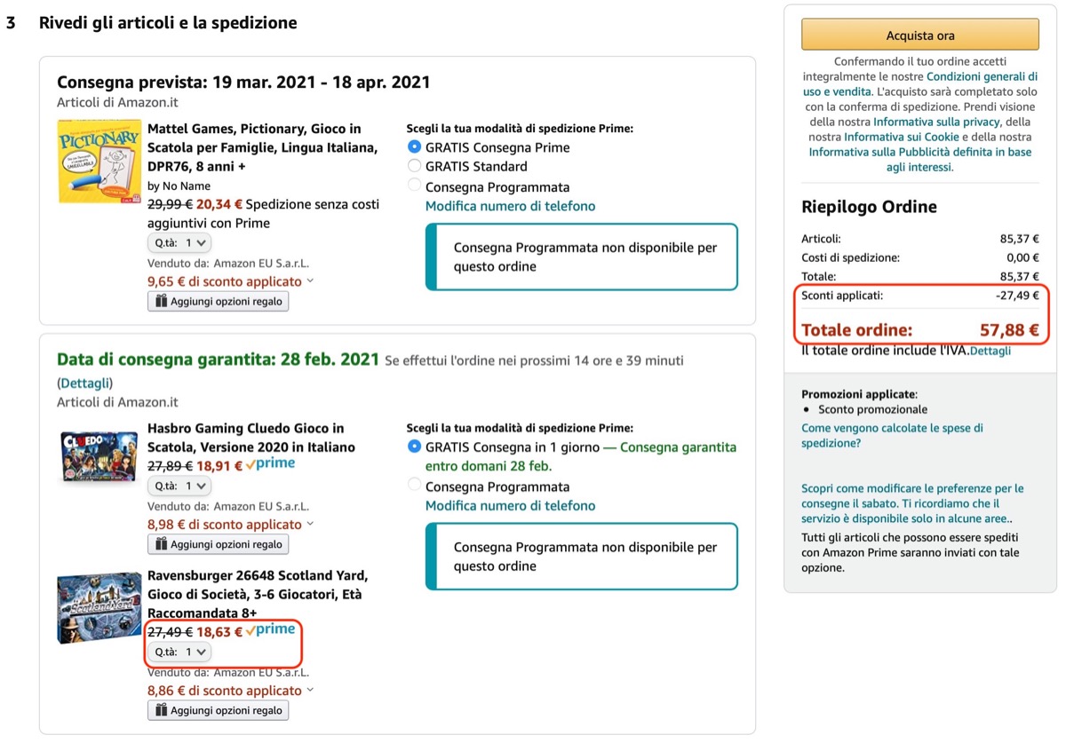 Il consiglio però è quello di prendere tre giochi che abbiamo più o meno lo stesso prezzo in modo da massimizzare il risparmio, perché ad essere offerto gratuitamente sarà chiaramente il meno costoso. Perciò se ad esempio aggiungete due giochi di società che costano 50 euro e un terzo che ne costa soltanto 10, il risparmio sarà appunto di 10 euro (il 9%) su una spesa finale di 100, mentre se il terzo gioco ne costa 40, spendete sempre 100 euro ma il risparmio è pari al 29%, molto vicino quindi al concetto del prendo-3-pago-2, dove il 33% è appunto il massimo sconto ottenibile.