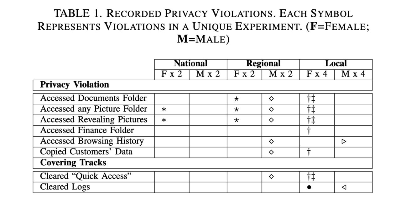 Ricercatori dell’Università di Guelph in Ontario (Canada) hanno spedito 12 computer in altrettanti centri di assistenza ed esaminato file di log (creati con meccanismi che erano stati predisposti di proposito) dopo la ricezione degli stessi per capire se i tecnici nei centri di assistenza avevano provato ad accedere a dati privati presenti sulle macchine.