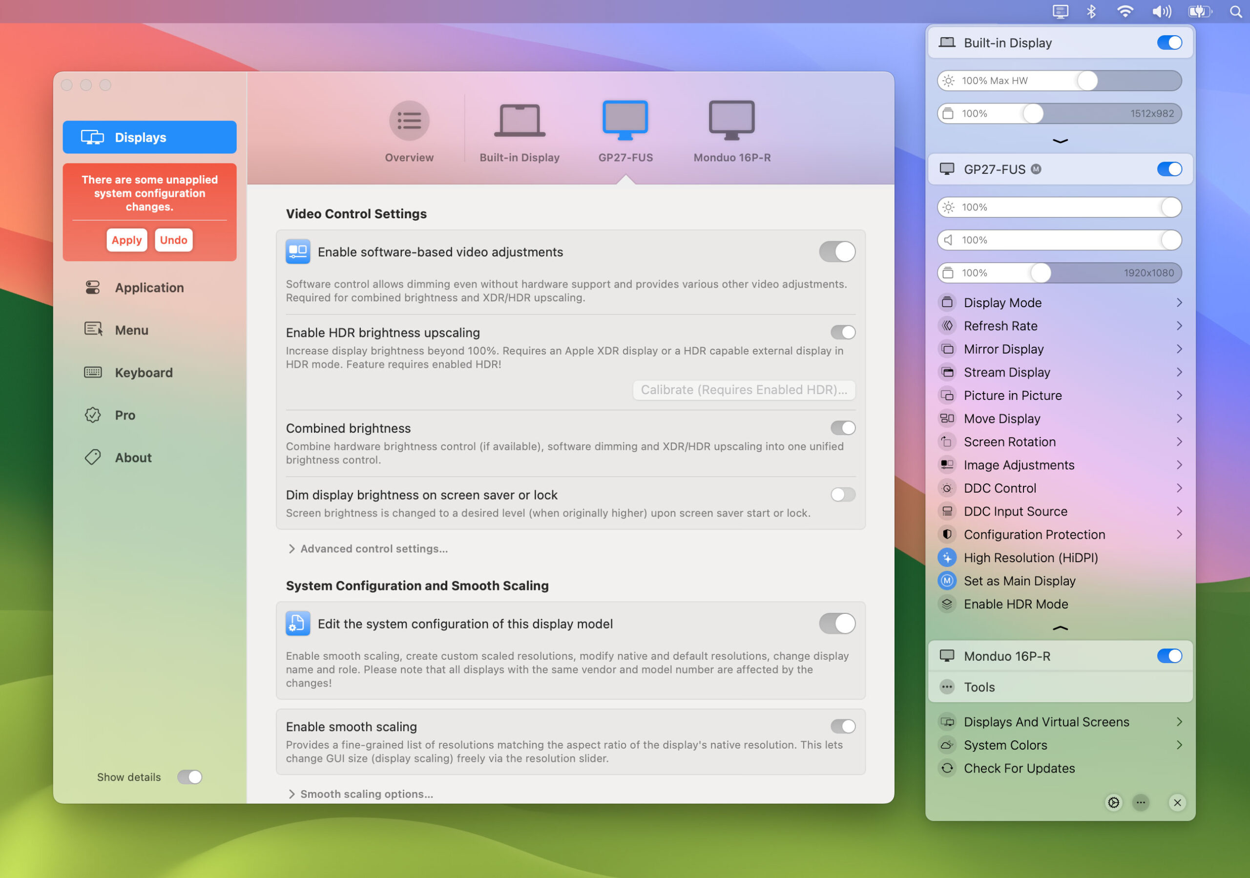 Tra le peculiarità di questa utility, la possibilità di richiamare varie impostazioni da una comoda icona della barra dei menu (es. luminosità), di gestire lo scaling XDR/HDR e personalizzare varie impostazioni di fino (con controlli non offerti di serie da macOS)