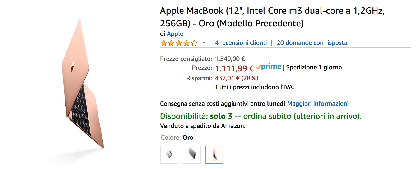 Il MacBook 12″ Retina non è un Air, ma è uno dei Mac usciti di produzione ad inizio settimana e anche questo è in forte sconto. In particolare il modello da 256 GB con processore da 1.2 GHz costa 1111,99 euro, un ribasso che vale il 28% in meno del prezzo ufficiale. Questa macchina, nonostante Apple l’abbia messa fuori produzione (forse per cercare di favorire l’idea che un iPad Pro è il dispositivo di riferimento per chi cerca un un dispositivo leggero), è ancora molto interessante per avere il massimo della portabilità. Ovviamente non si possono fare cose complesse, ma per scrivere, navigare, film e “massaggiare” è ottimo