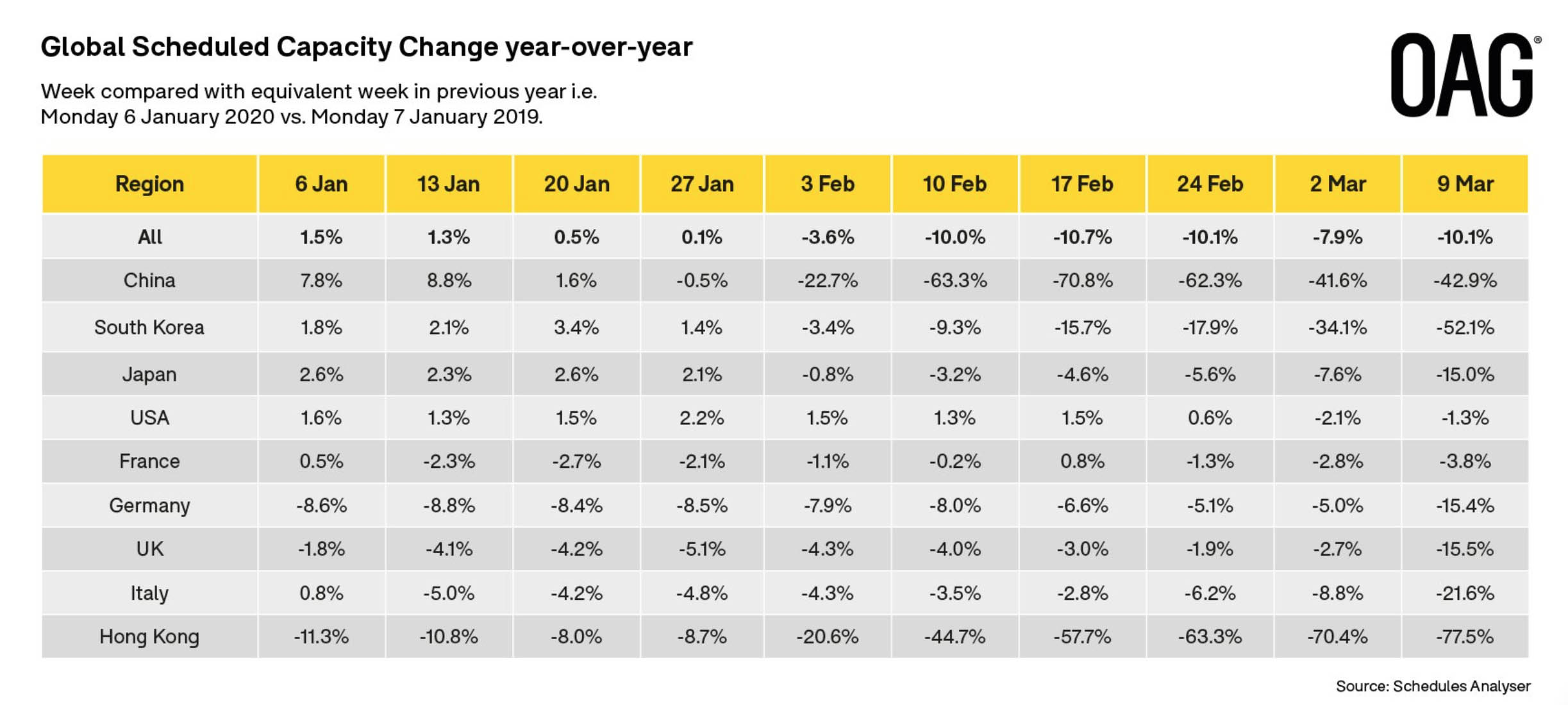 OAG, azienda del regno Unito specializzata in dati e analisi sui viaggi a livello mondiale e altri dati nel trasporto aereo, ha pubblicato la sua ultima analisi dell’impatto globale del coronavirus sul mercato dei trasporti aerei.