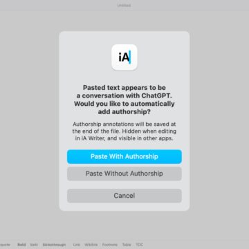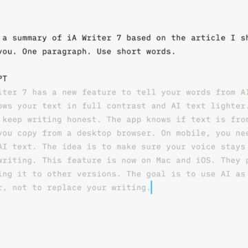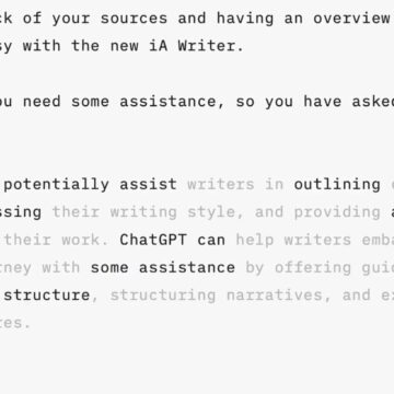 Detto in altre parole: “iA Writer consente di distinguere le proprie parole da quelle prese in prestito mentre ci si scrive sopra. Man mano che si digita sul testo generato dall’intelligenza artificiale, lo si vede diventare proprio”.