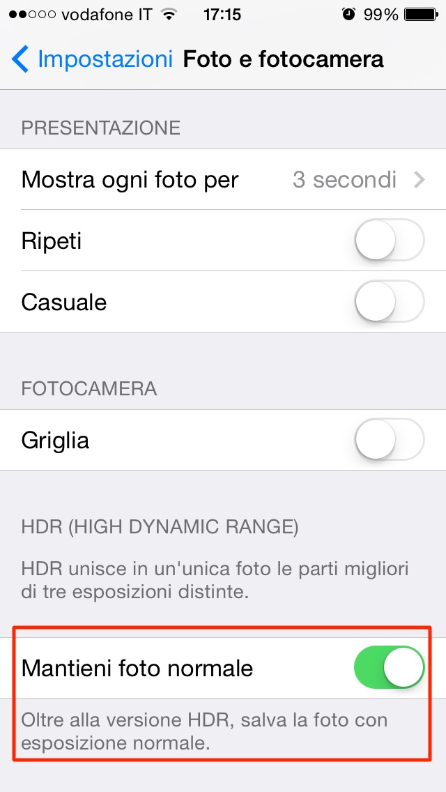 Naturalmente con un tap su HDR Auto è sempre possibile modificare l’impostazione per disattivare l’HDR oppure per attivarlo a mano. Infine all’interno di Impostazioni, Foto e fotocamera, in basso nell’elenco possiamo scegliere se salvare solo la foto realizzata con HDR oppure se salvare anche l’immagine catturata con esposizione normale. Quest’ultima opzione è attiva di serie ed è quella consigliabile per evitare di scoprire una immagine HDR mal riuscita, quando ormai è troppo tardi per realizzarne un’altra senza l’effetto.