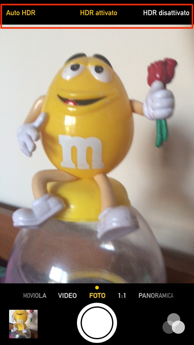 Quando l’HDR viene impiegato compare un riquadro giallo ben visibile in basso nella nostra inquadratura, in questo modo l’utente è avvisato: per scattare foto con buoni risultati in HDR è consigliabile evitare soggetti in movimento e occorre prestare un po’ più di attenzione a rimanere fermi durante lo scatto, pena una foto rovinata.
