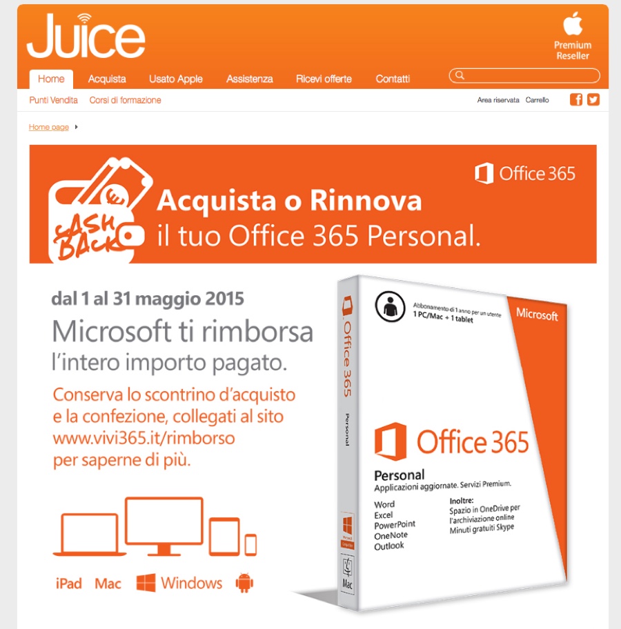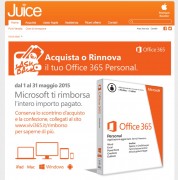 Nei negozi della catena Juice è possibile acquistare e rinnovare Microsoft Office 365 Personal al prezzo di 69 euro oppure scontato a 49 euro in abbinamento a un Mac o iPad. Per chi effettua l’acquisto entro il 31 maggio è possibile ottenere il rimborso completo dell’importo pagato, una promozione da non perdere per chi necessita i programmi di produttività Microsoft per lavorare su Mac, Windows, iPad e anche tablet e smartphone Android.