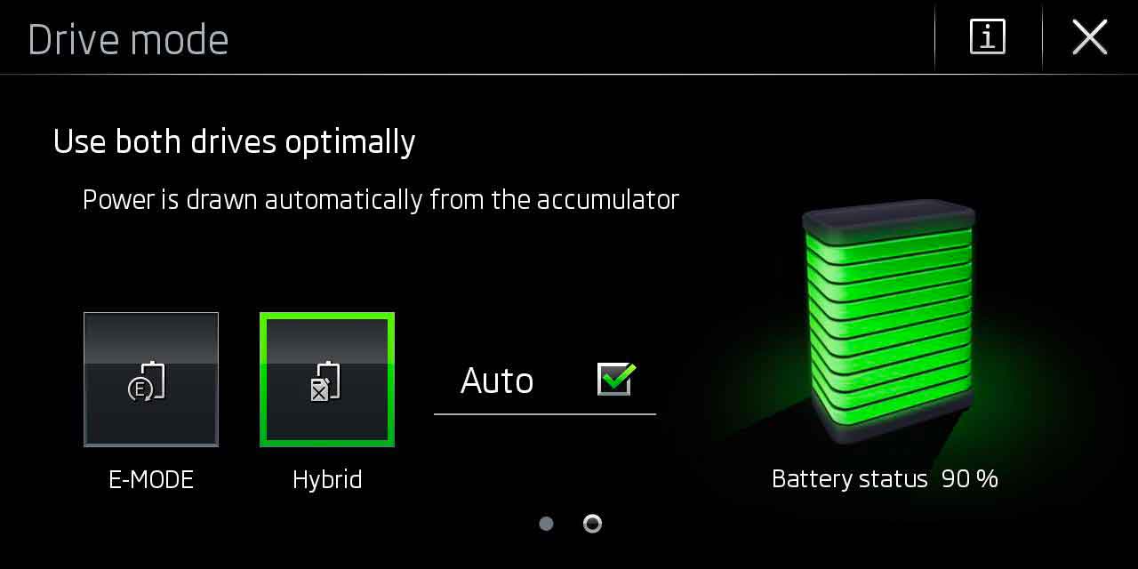 Il motore elettrico da 85 kW può spingere l’auto in modalità a zero emissioni oppure lavorare in sinergia con il motore termico per migliore l’efficienza complessiva. Il sistema Driving Mode Select di serie offre tre impostazioni: modalità Sport, Elettrica e Ibrida. In Sport vengono messi a disposizione 218 CV (160 kW) e 400 Nm di coppia massima. In modalità Elettrica, è possibile percorrere con la sola energia della batteria fino a 56 km con velocità massima di 140 km/h, mentre in modalità Ibrida l’elettronica regola la cooperazione tra i due motori.