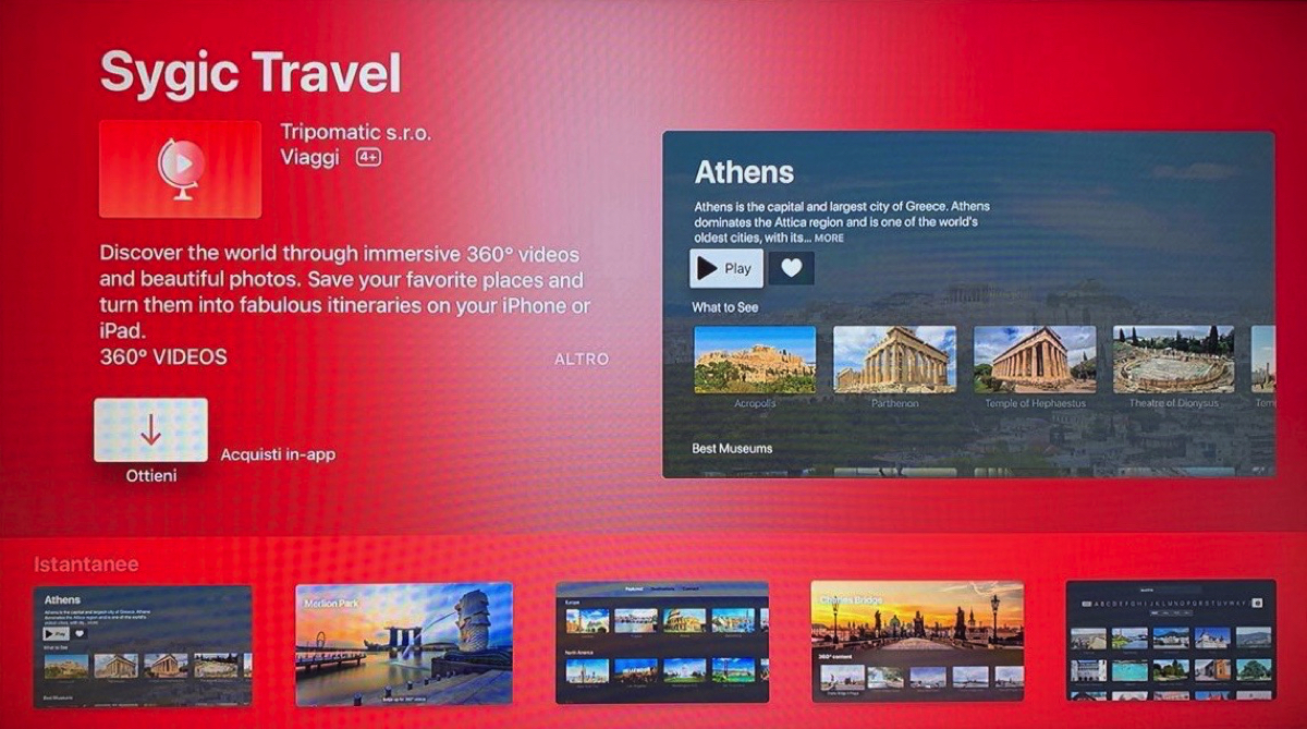 L’app Sygic Travel per Apple TV mette a disposizione fino a 5.000 video a 360 gradi che permettono di esplorare alcune delle località turistiche più famose e ambite del mondo. Si tratta della prima app per Apple TV realizzata da Sygic, sviluppatore specializzato in app di cartografia e navigazione GPS già presente su iPhone, Apple Watch, Apple CarPlay e dispositivi Android con app dedicate.